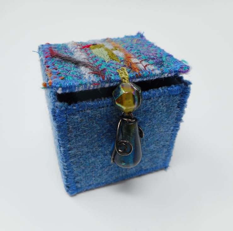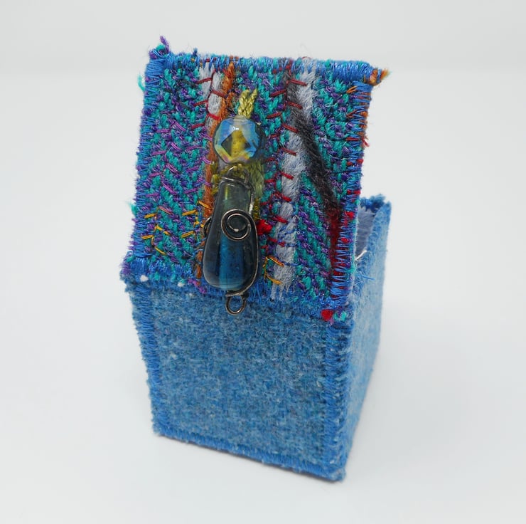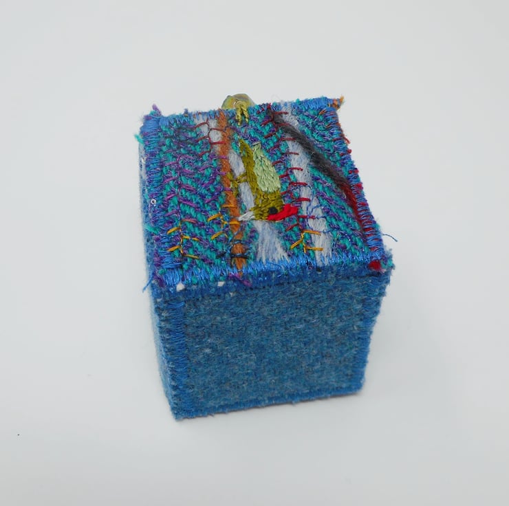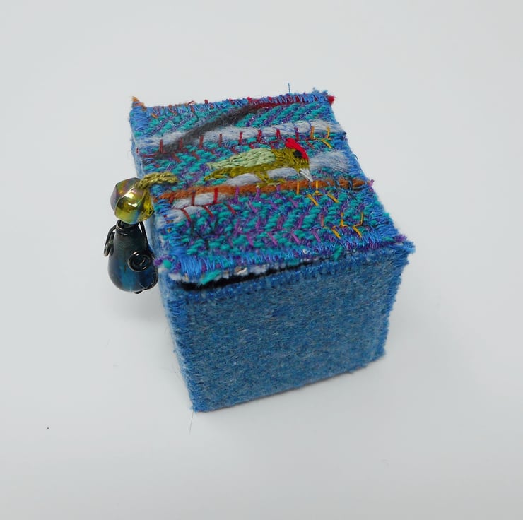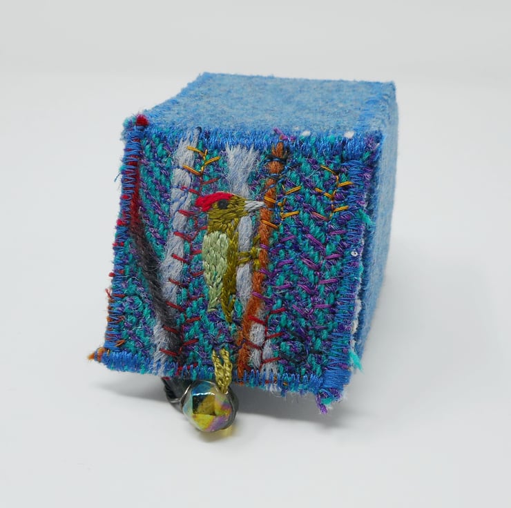 The main body of the box outer is made from wool tweed in soft blues. The lid is made from a handmade textile based on a tiny offcut of harris tweed. Wool yarn, needlefelting and hand and machine embroidery have been used to create my green woodpecker design.