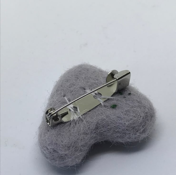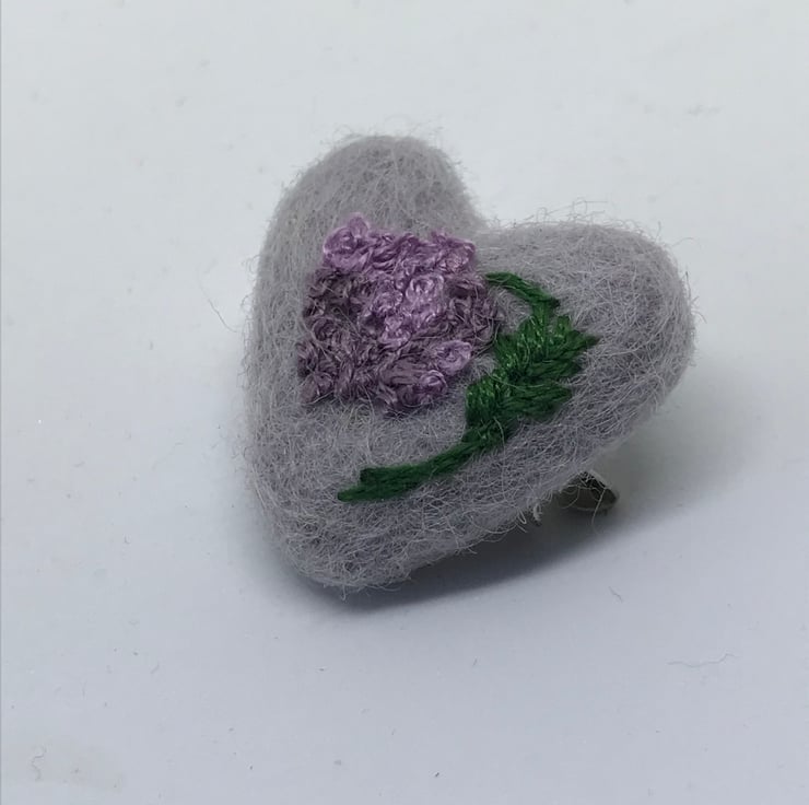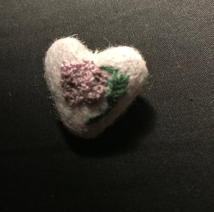 Needle felted heart embroidered with embroidery threads. This is a lovely shade and of lilac and has a simple flower and stem embroidered onto the needle felted heart shape. I have sewn a brooch pin on the back so you can pop it onto a favourite matching jumper , jacket, coat or dress. I like the thought that you can send your heart to a loved one in the form of a brooch. It comes complete with a 2 inch square kraft jewellry box.