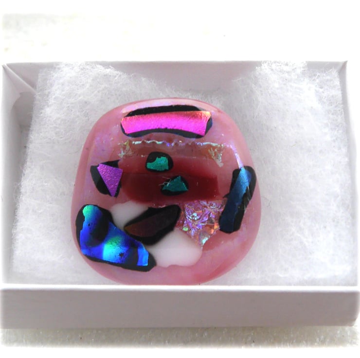 The brooch comprises 2 layers of carefully hand-cut fusing glass Coe 90.