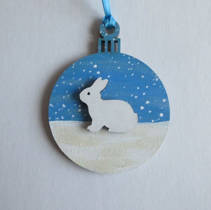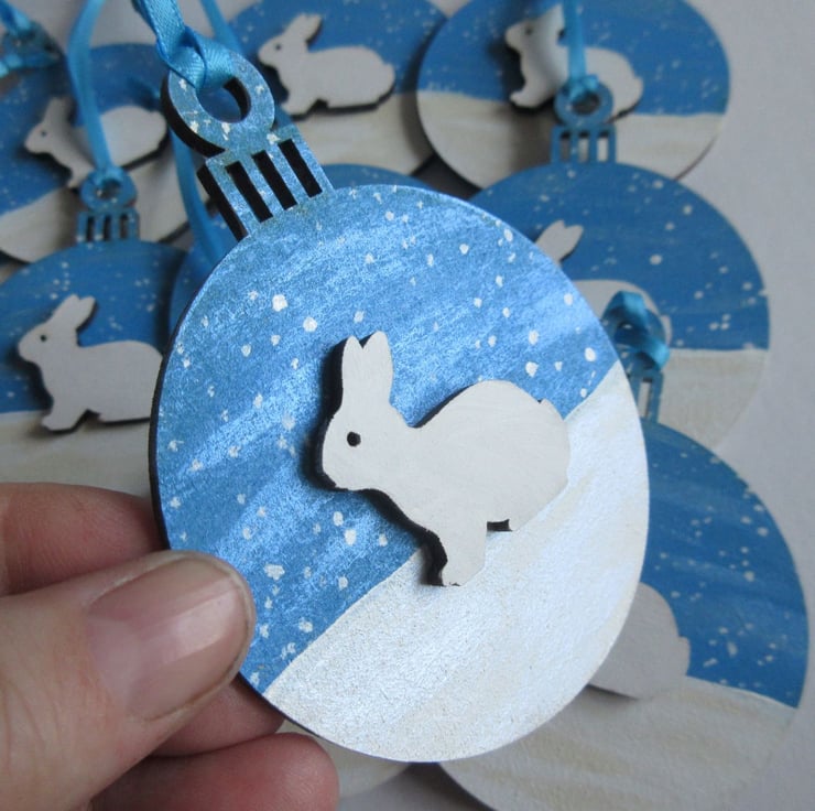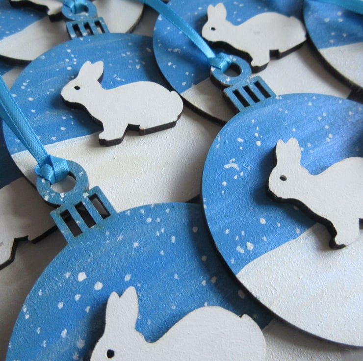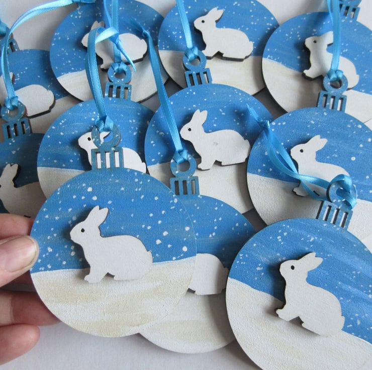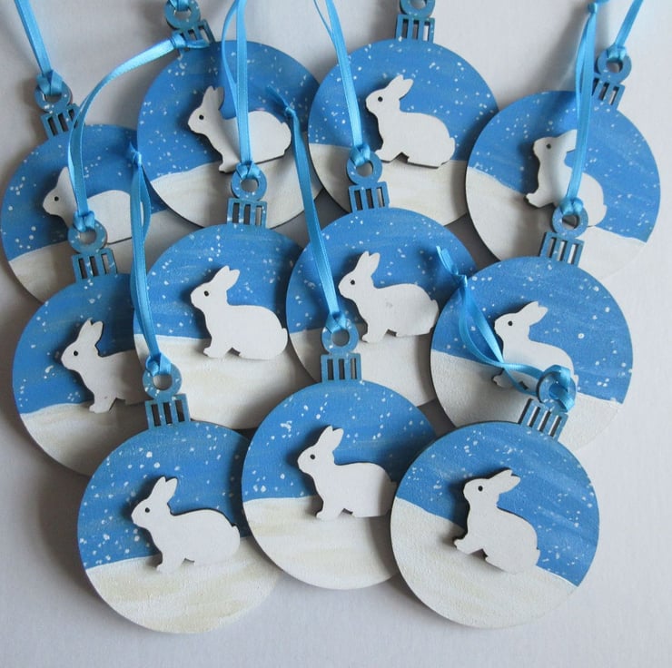 This is a set of 6 2D wooden bauble shapes, each hand painted with a winter background of a snow scene, and embellished with a little wooden bunny shape, painted white.