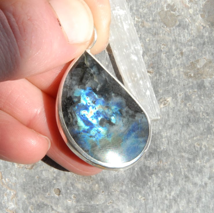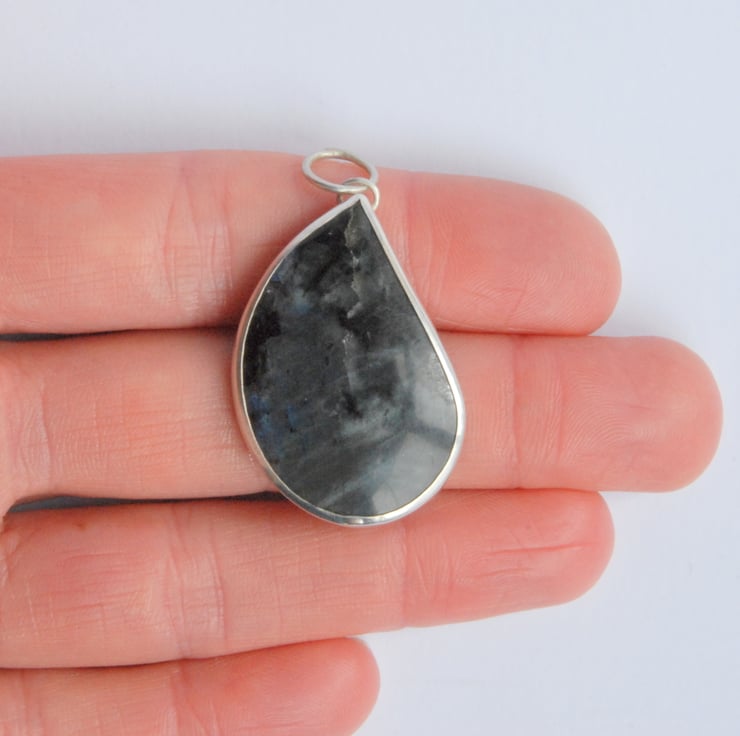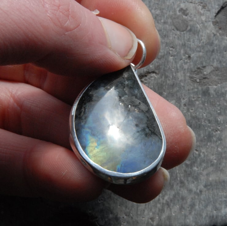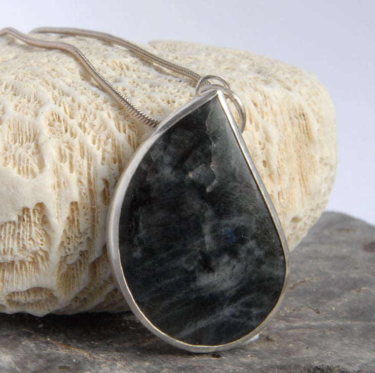 This pendant features an unusually shaped piece of spectrolite which has been smoothly bezel set in sterling silver. Spectrolite is related to labradorite and displays the same flashes of colour, in this piece they are blue and orangey yellow, but whilst labradorite has a grey or brown back ground colour spectrolite has a black/ dark grey back ground. The flash of colours against the black reminds me of the northern lights against the midnight sky. Spectrolite is only found in one part of Finland where the mining season is fairly short due to the cold weather, I bought the rough that this cabochon was cut from whilst visiting Finland and then had it custom cut back in the UK. After some debate on social media we decide that the shape is best describes as paisley with wonky teardrop coming second, either way I really like it as a shape and it adds a certain something to the pendant.