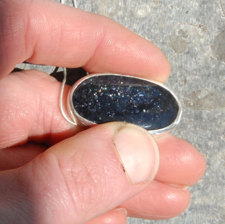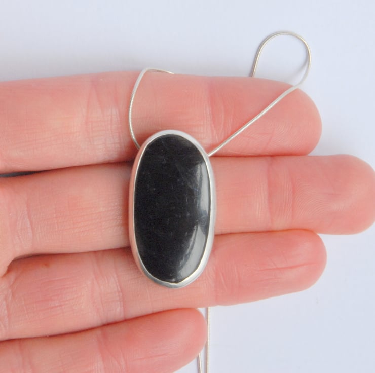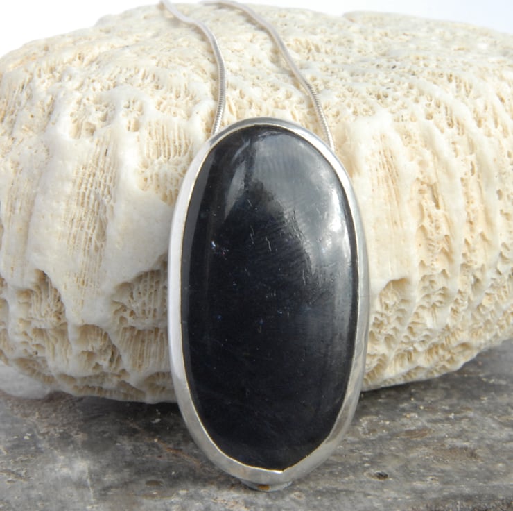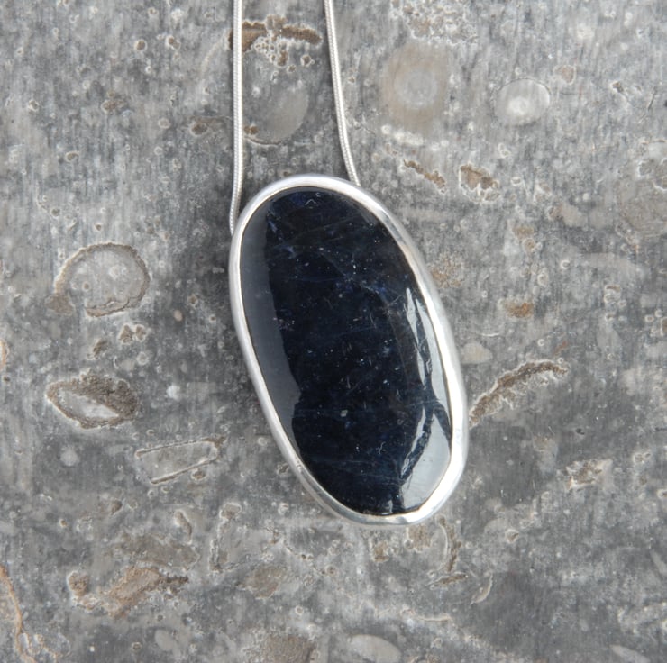 This minimalist slider pendant features an oval of confetti iolite smoothly set in sterling silver. The iolite is a deep, dark, inky purple that looks almost black but what makes this piece particularly special are the naturally occurring internal spangles which glitter like confetti when the sun catches them (I've tried my best to show these in a photo). The pendant measures 32mm by 18mm and slides along an 18 inch sterling silver snake chain. Comes gift boxed.
