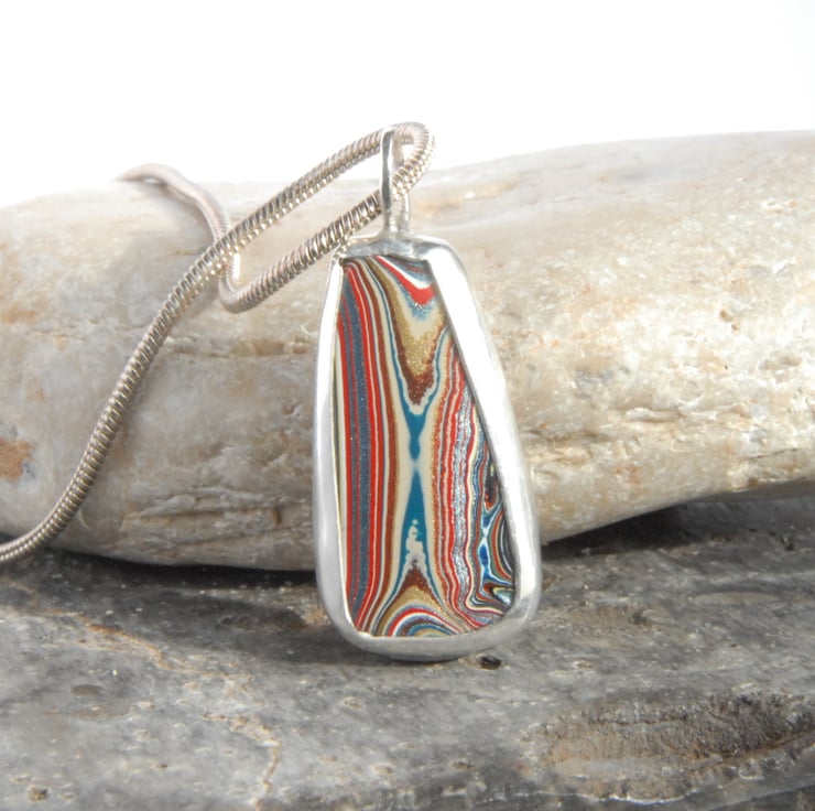 This sweet, little pendant has a trapezoid piece of vintage fordite as its focal point. The fordite has been smoothly bezel set in sterling silver and finished with a simple loop bail. The pendant has an open back setting so is reversible, the pattern on the front is in shades of red, blue, gold and beige, the back has much finer stripes and a small section of concentric rings. Measures 27mm (inc bail) by 12mm and comes in a gift box with a sterling silver chain (if you'd prefer a leather or cotton cord drop me a message).