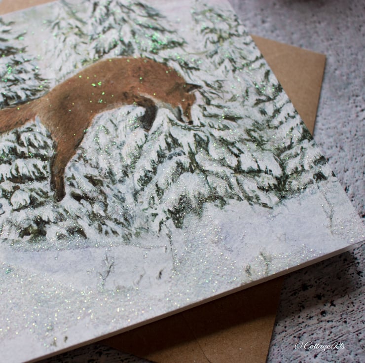 The Red Fox designs for these Christmas cards were originally hand painted by us at CottageRts before being printed onto 300gsm card. Each card has then been hand finished with eco friendly glitter.