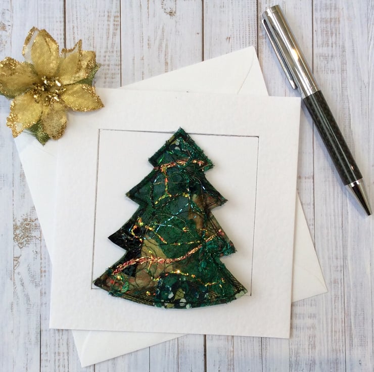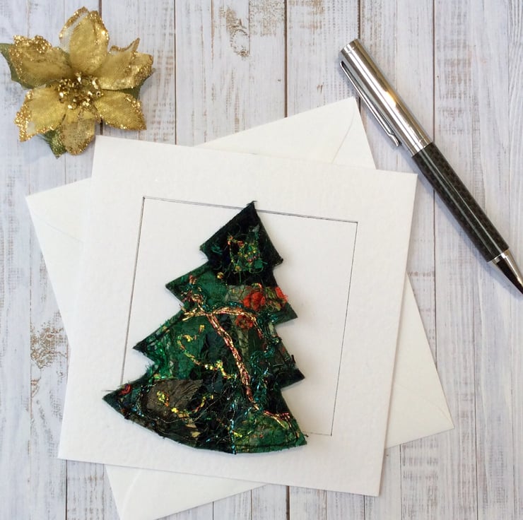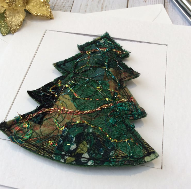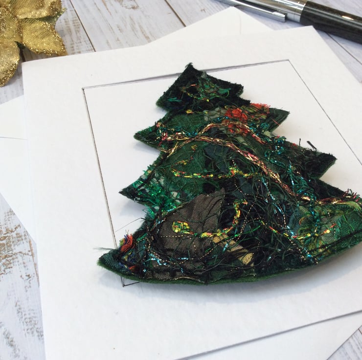 This embroidered Christmas tree card is also a Christmas decoration. Its been made with my own handmade up-cycled fabric. This dramatic fabric contains silk, wool, threads, cottons, sequins and netting etc. and is enhanced with free motion embroidery. It’s perfect for a season greetings or a special Christmas card. The tree is easily detached from the card with a ribbon for hanging.