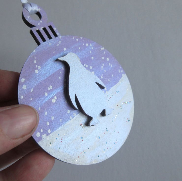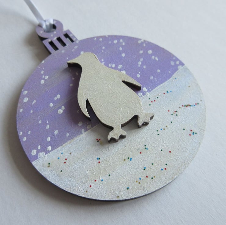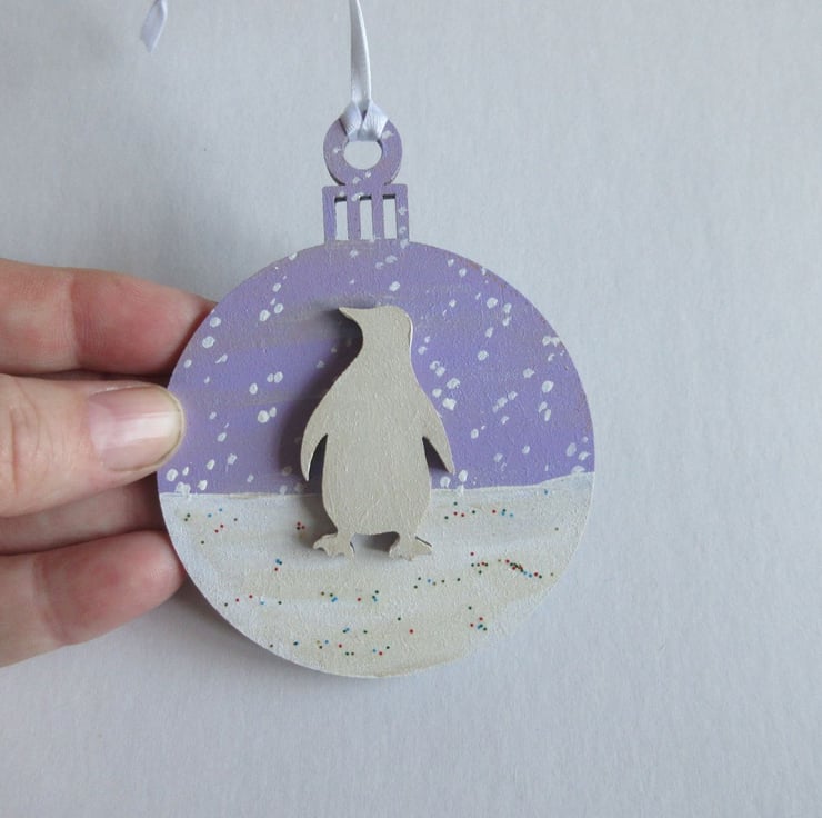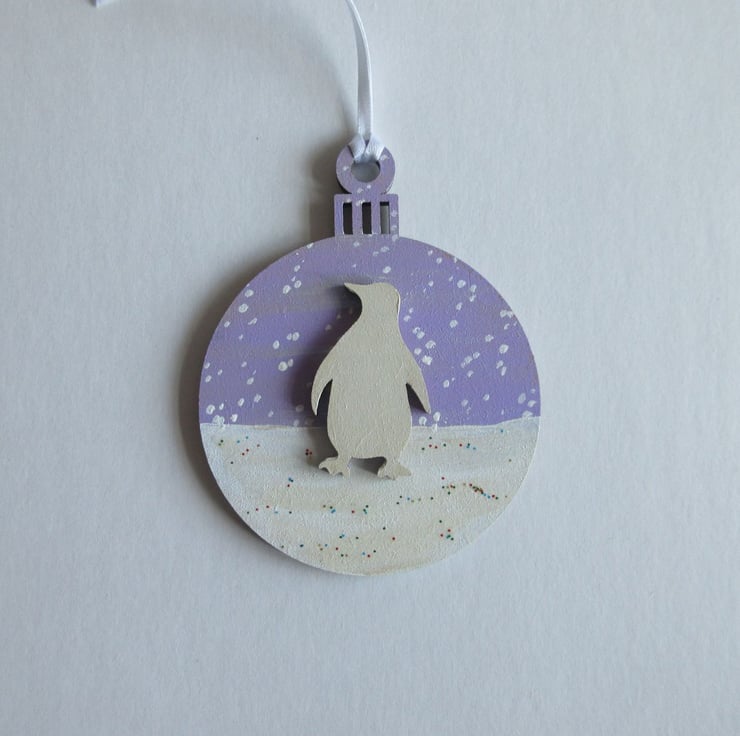 This is a 2D wooden bauble shape, hand painted with a winter background of a snow scene, and embellished with a little wooden penguin shape, painted white.