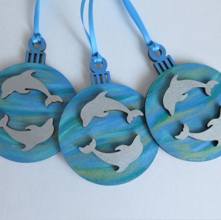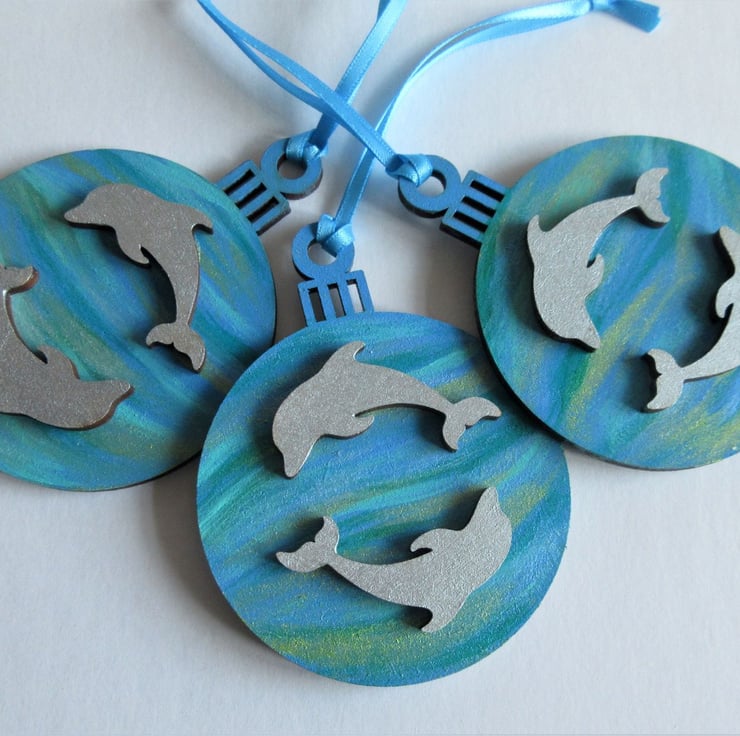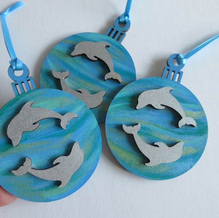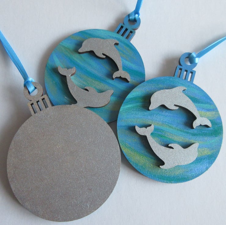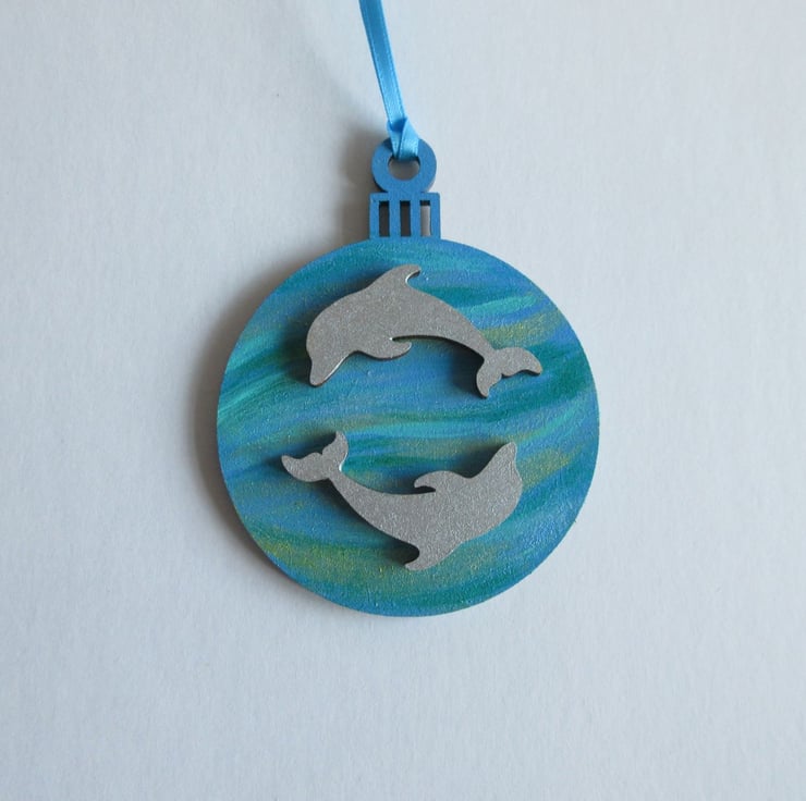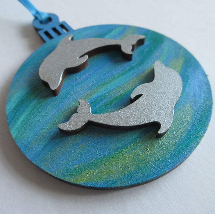 This is a 2D wooden bauble shape, hand painted in ocean colours, featuring two wooden dolphin shapes, painted in metallic silver.