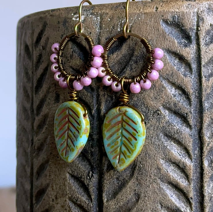 The leaves hang from hand-antiqued brass rings adorned with Czech glass rounds in a soft pink shade with shimmering bronze lustre, each bead meticulously wire-wrapped around the rings.