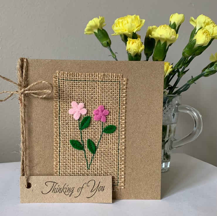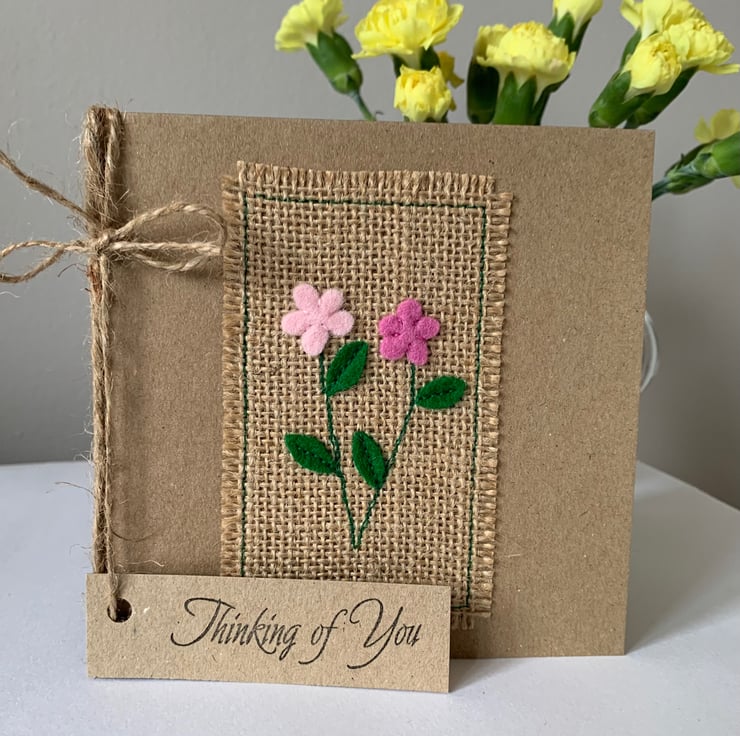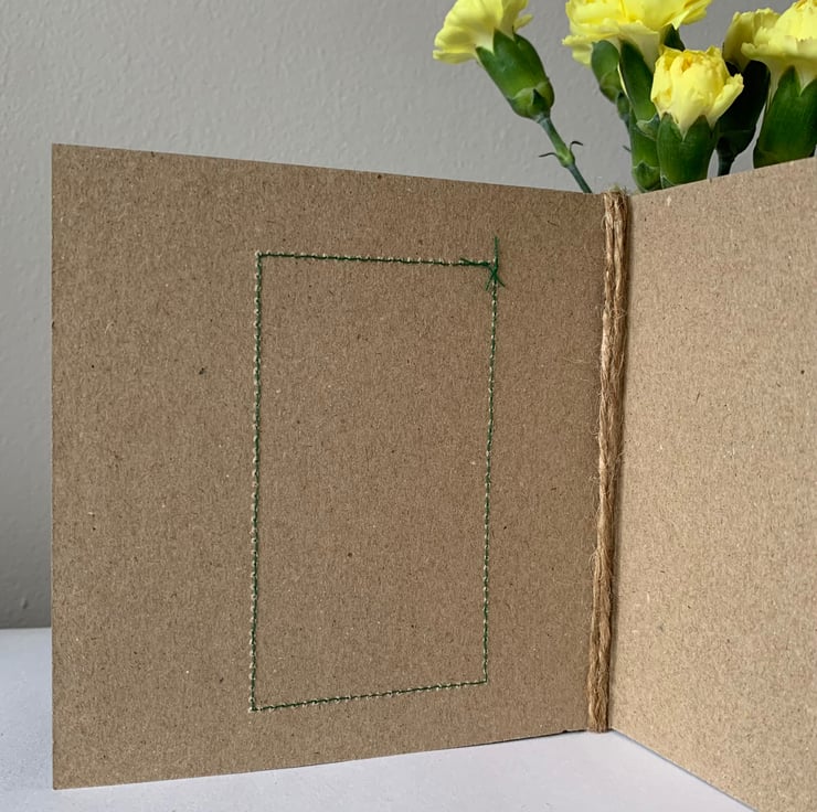 The hessian is machine stitched using a contrasting thread, onto a plain brown recycled card. This stitching is visible on the inside of the card.