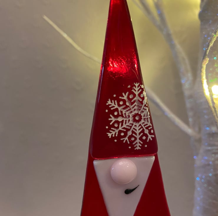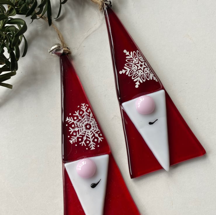 A fused glass Christmas Santa or gnome! He has a red hat with a snowflake design which has been screen printed on in white enamel, long white beard and a cute pink nose! He hangs from a hessian string with a silver bell .