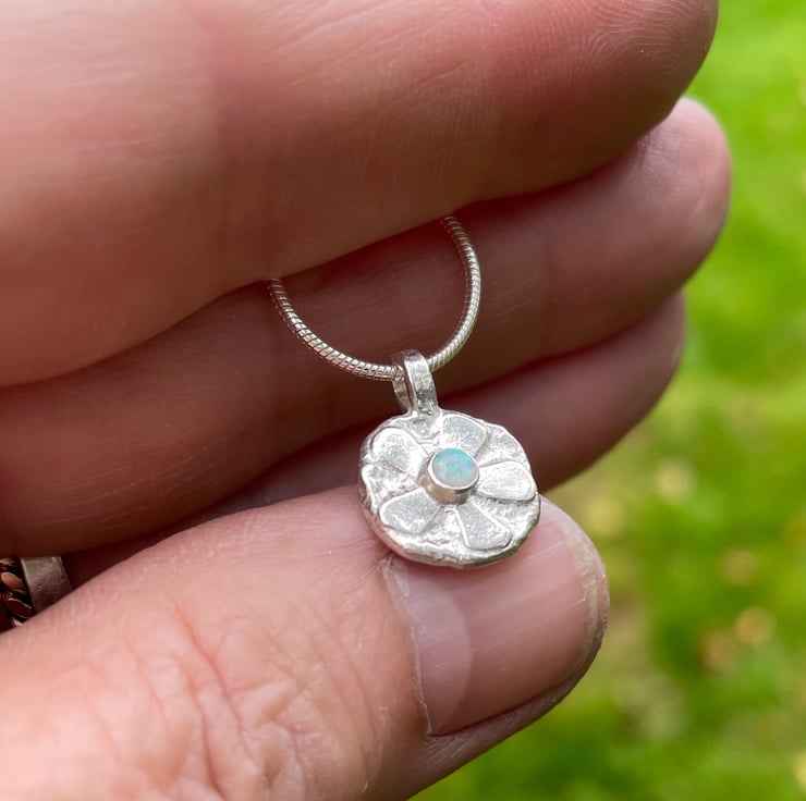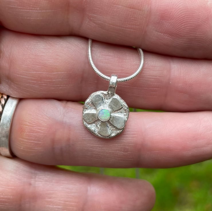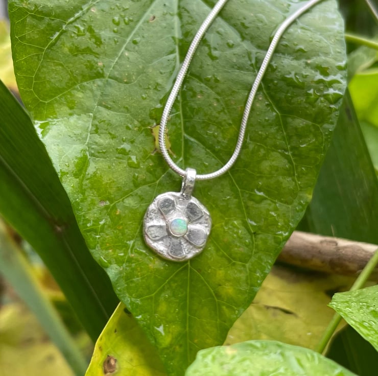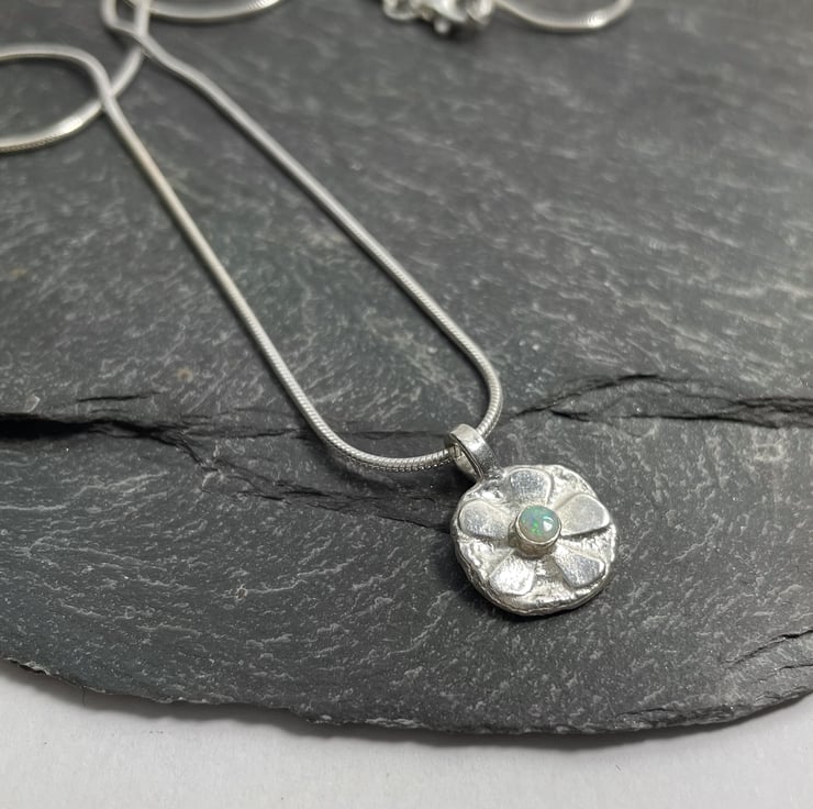 A small stylised sterling silver flower pendant with a beautiful colourful natural opal cabochon centre. Hung from an 18” sterling silver snake chain.