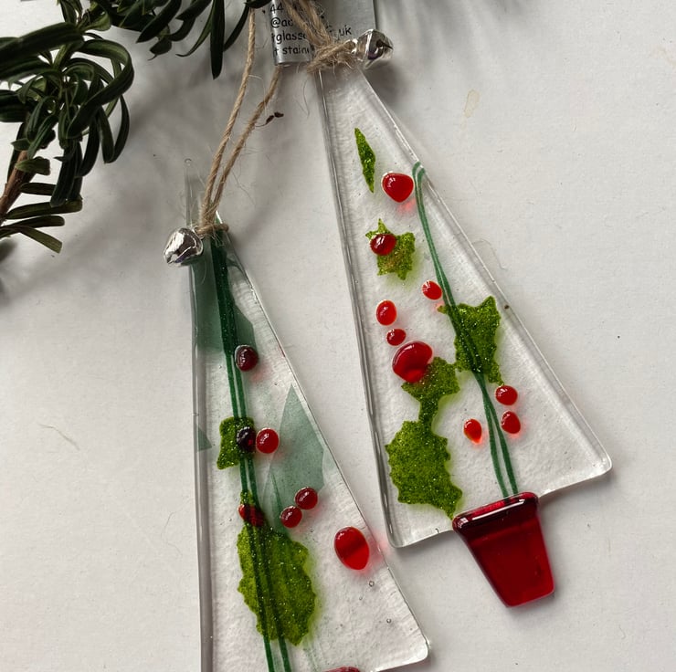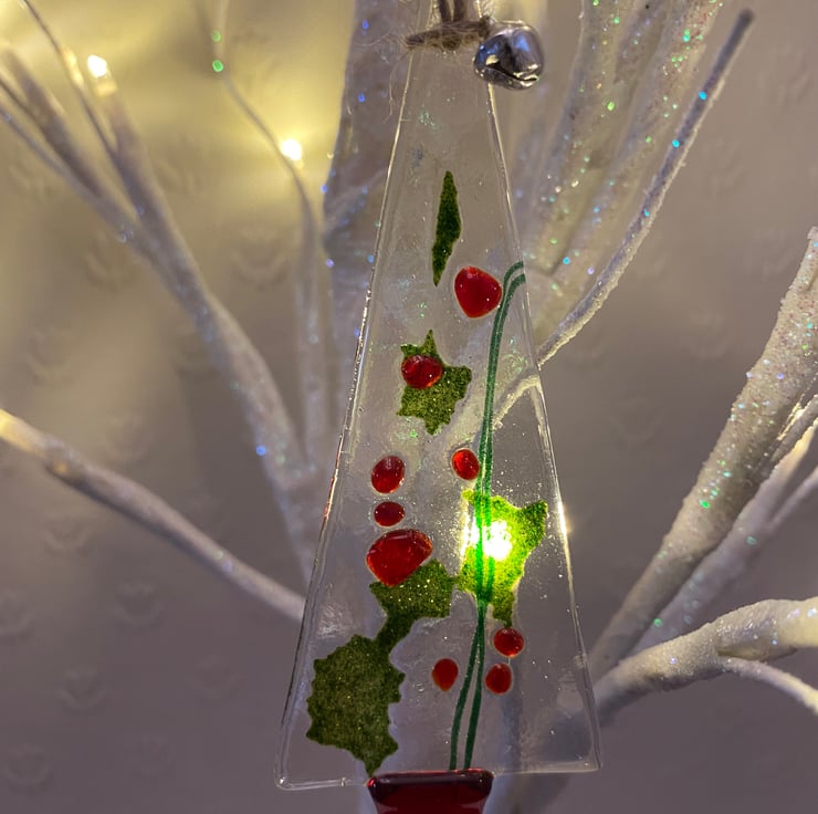 A beautiful fused glass Christmas tree in a gorgeous holly berry glass which consists of red berry blobs , green confetti glass and green stringers ( each one is a random design and will be slightly different) It has a red pot and hangs from a hessian string with a small bell or silver coloured star .
