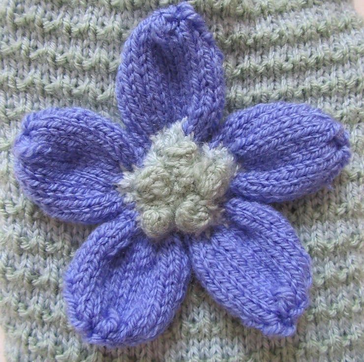 A beautifully hand knitted stripy blue and green coloured hot water bottle cover, with an oversized daisy flower on the front. The body of this hot water bottle cover is knitted in narrow stripes of duck egg blue and pale green coloured yarns. The pale green stripe has a soft nobble giving a wonderful texture. The neck and bottom edge are knitted in duck egg blue rib ensuring a good snug fit of the hot water bottle. The back envelope style opening has a good overlap but allows sufficient ease when refilling with hot water. The lavender coloured oversized knitted daisy flower has a pale green centre and is secured safely to the front.