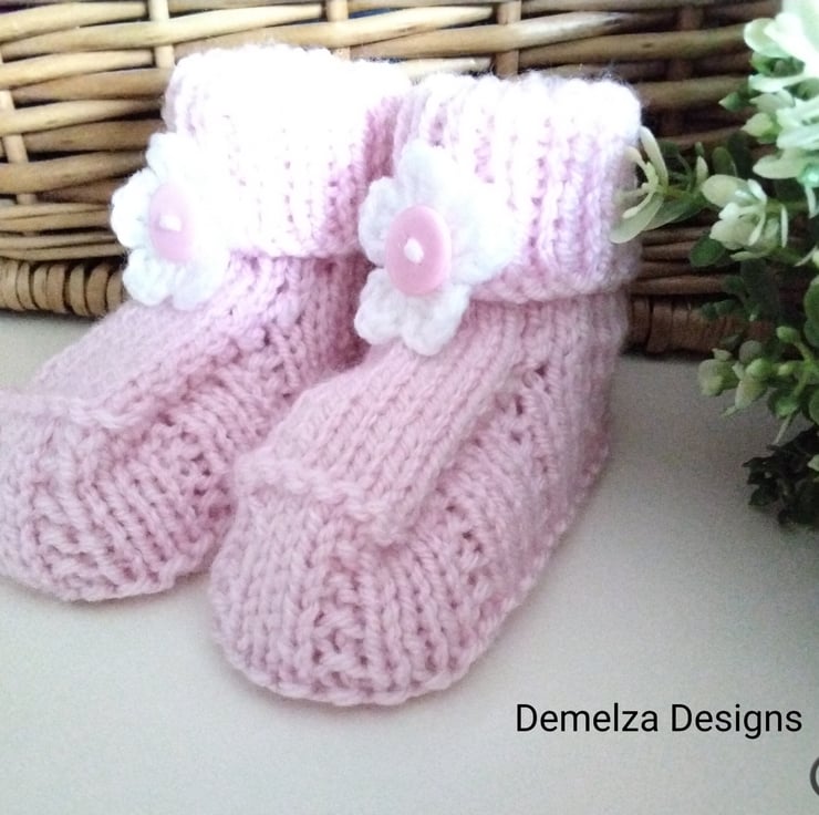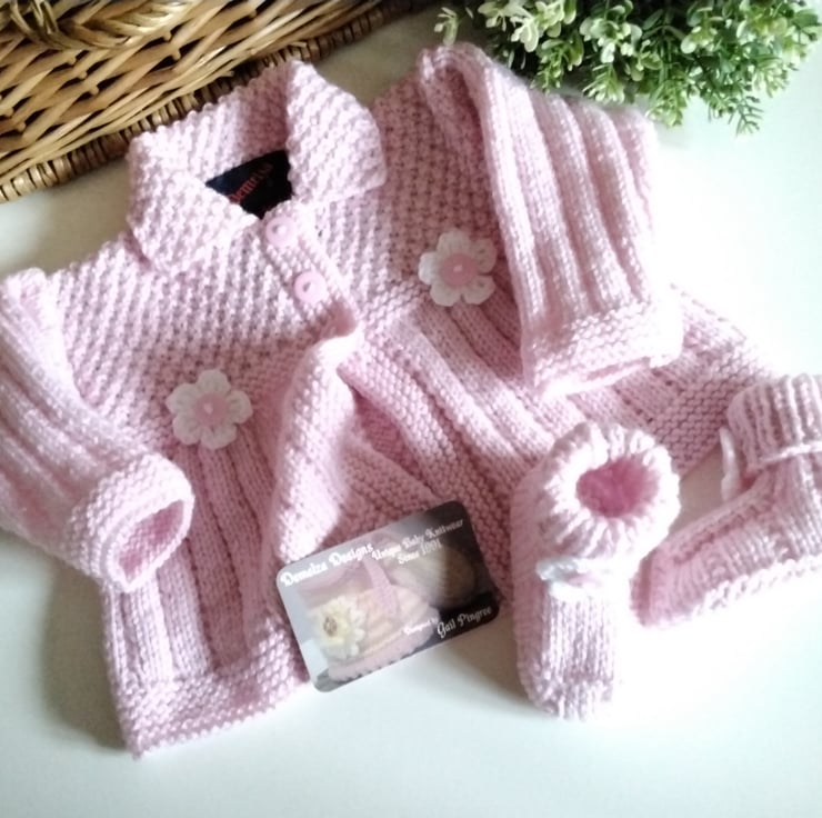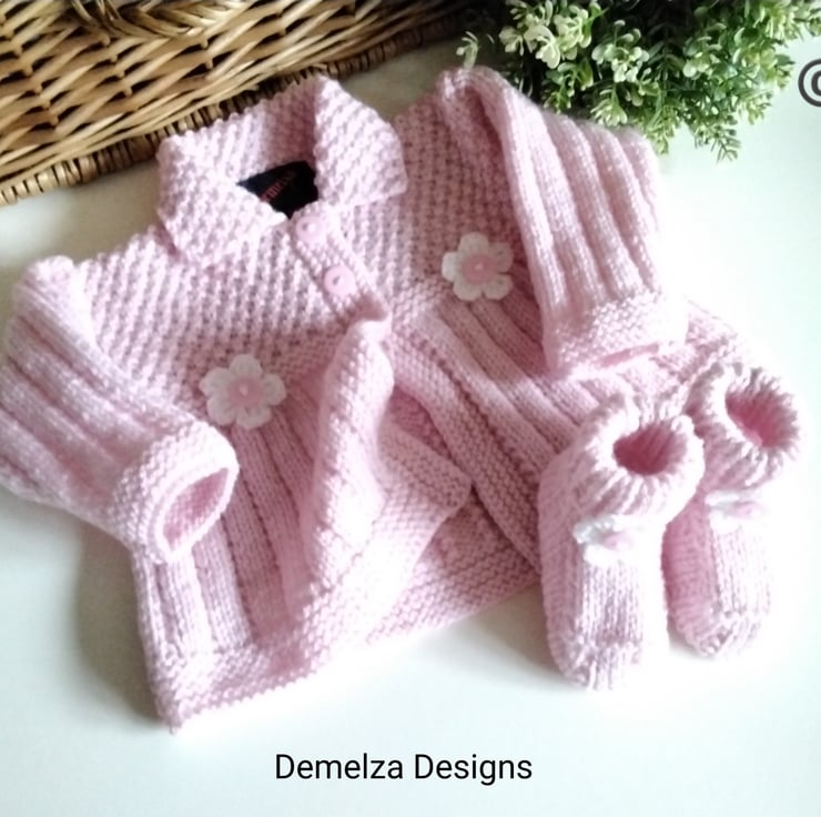 A very sweet cosy warm hand knitted baby girl's matinée jacket and matching booties designed and lovingly hand crafted for any newborn baby girl. On the jacket back neck edge is the luxery Demelza Designer garment label with the care instructions woven within it on the reverse side for lasting reference and as proof of it's origins if gifting. A Demelza Designs garment swing tag will be attached to the front of the matinée jacket.