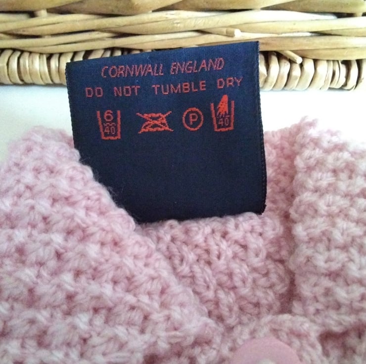 Baby knitwear is designed and hand crafted by Demelza Designs in Cornwall meeting UK baby safety standards, Only branded premuim acylic, acrylic/natural fibre blends or pure natural fibre yarns are used in baby knitwear which conforms to BS984/76 standards.