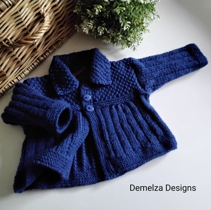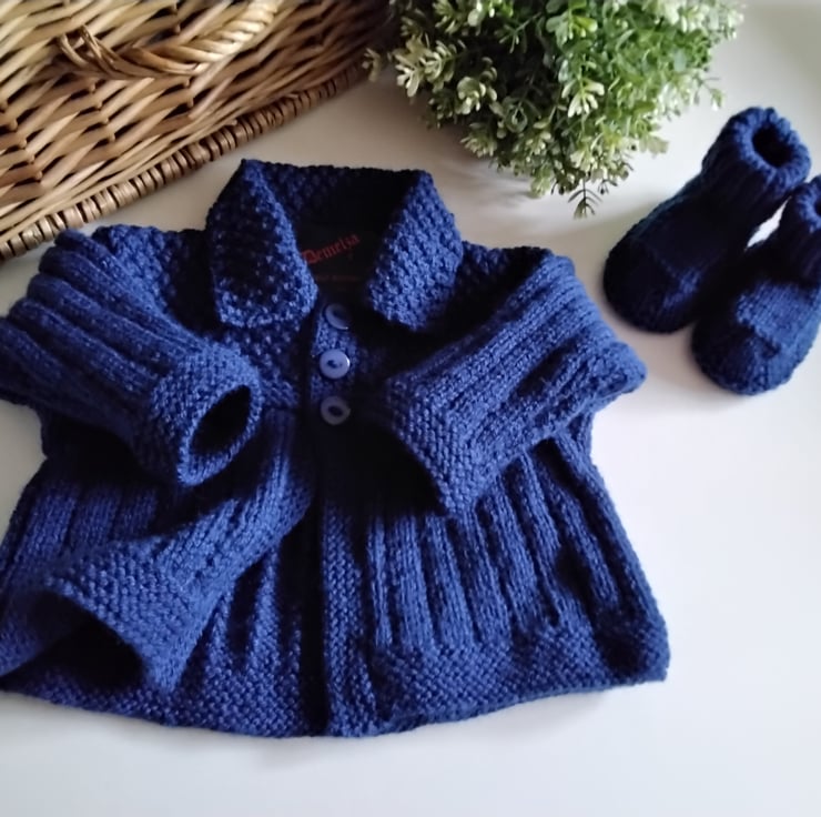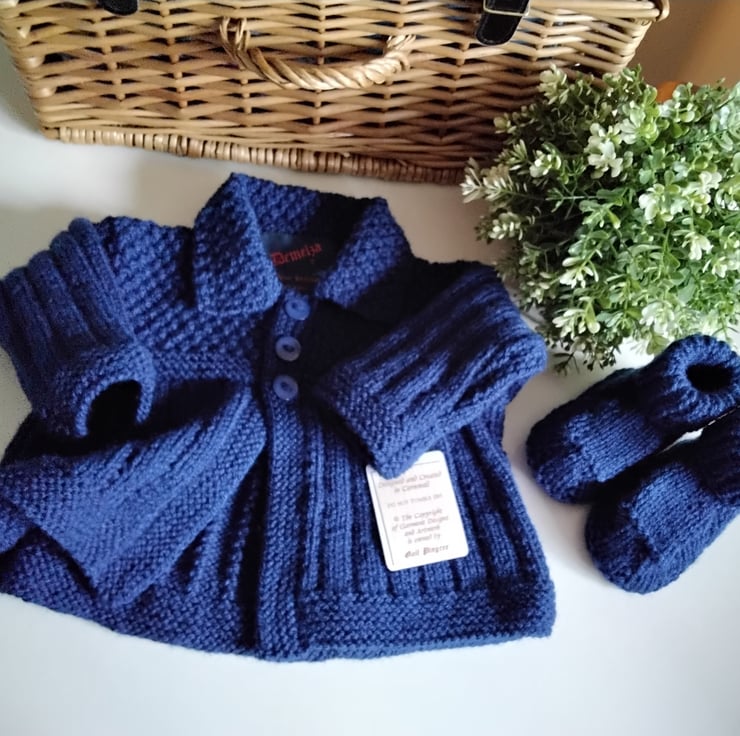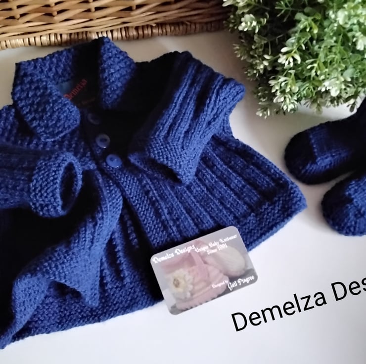 A very sweet cosy warm hand knitted baby matinée jacket and matching booties designed and lovingly hand crafted for any newborn baby. On the jacket back neck edge is the luxery Demelza Designer garment label with the care instructions woven within it on the reverse side for lasting reference and as proof of it's origins if gifting. A Demelza Designs garment swing tag will be attached to the front of the matinée jacket.