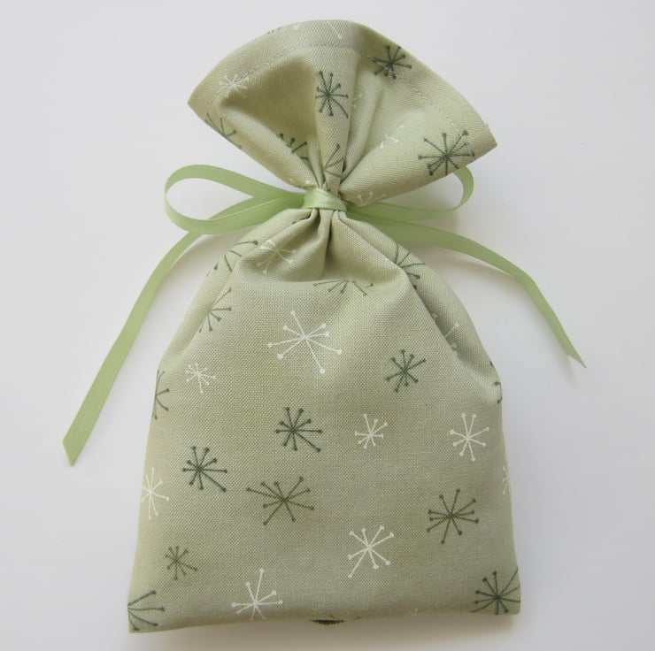 Lavender drawer sachet made from a pale green star patterned fabric and decorated with a vintage embroidered basket of cherries design trim.