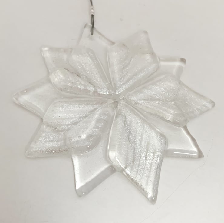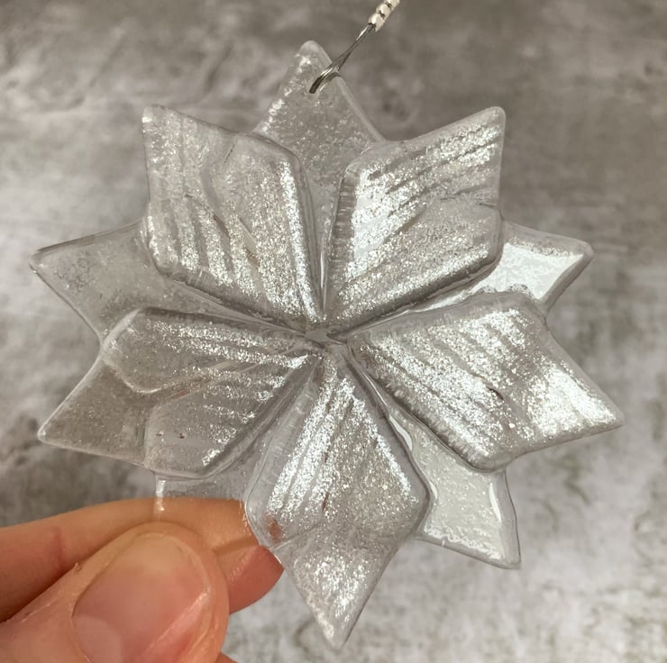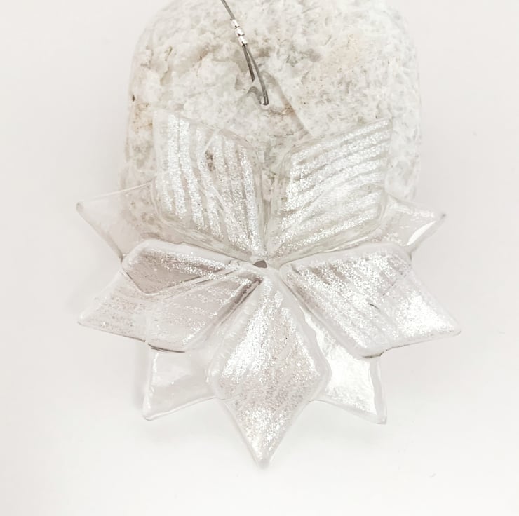 Fused glass hanging star Christmas decoration with subtle silver stripe design. These stars look lovely hung in a window or on a Christmas tree and make lovely gifts.