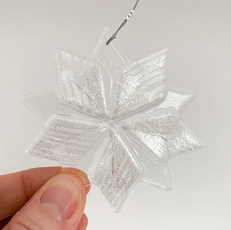 To make these stars, I start by cutting 10 diamond shapes form transparent art glass. I then arrange them in a star pattern and paint on my silver design. Then I fire them at a slighly lower temperature than normal, to enable the edges to stay defined and give them a crisp look. Each star is hand cut and assembled, therefore no 2 are exactly the same.