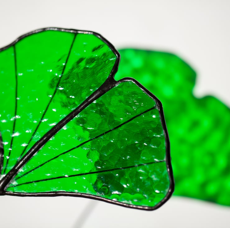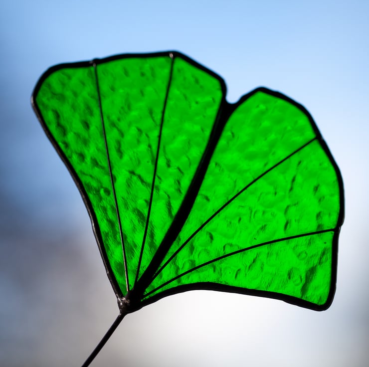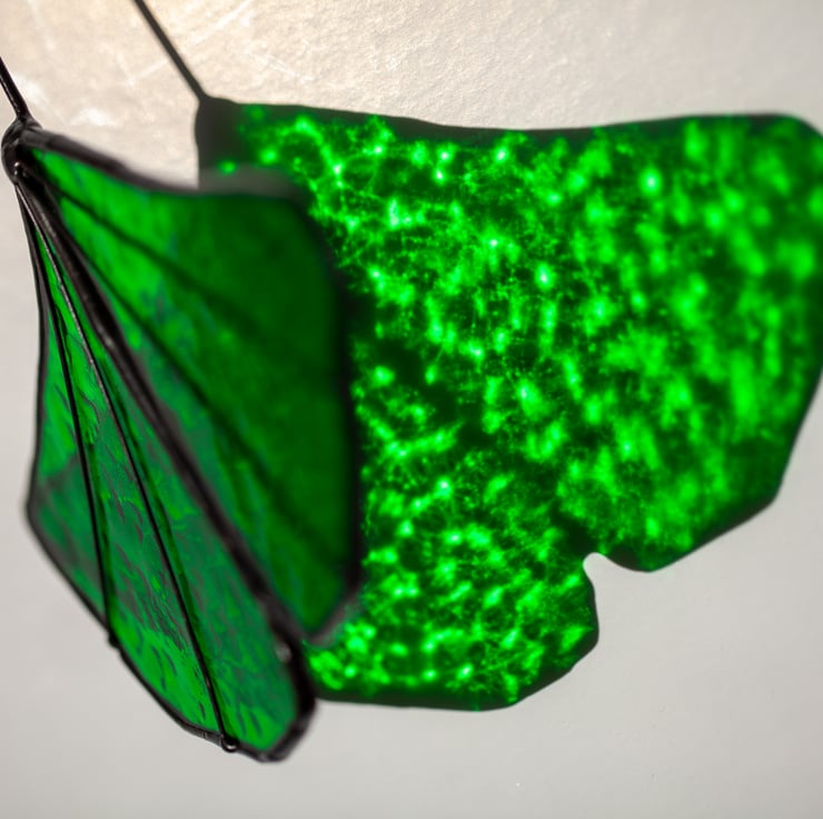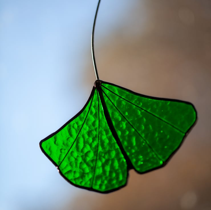 This stained glass suncatcher has been made from stained glass using the Tiffany technique. The glass has lovely texture. It is finished in black patina, polished and set in a piece of waxed oak. Overall size of the ornament is 21x12cm (HxW)