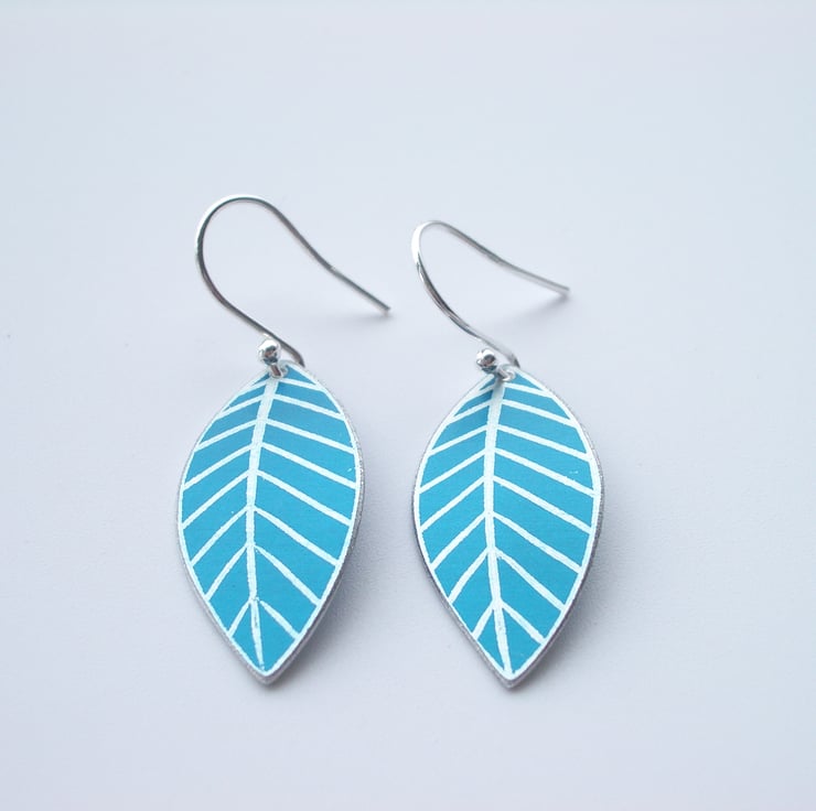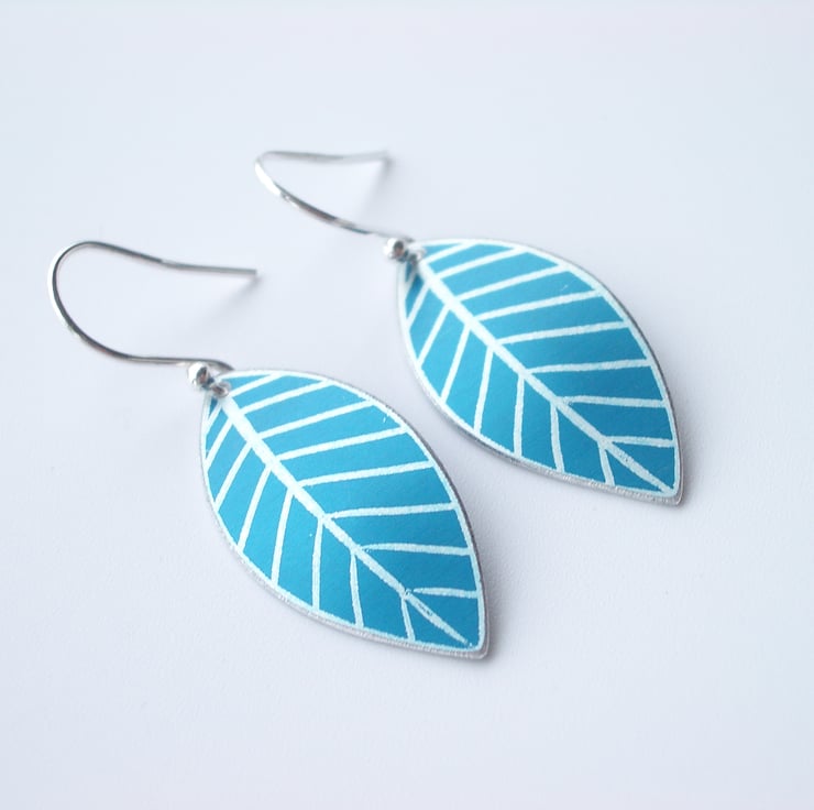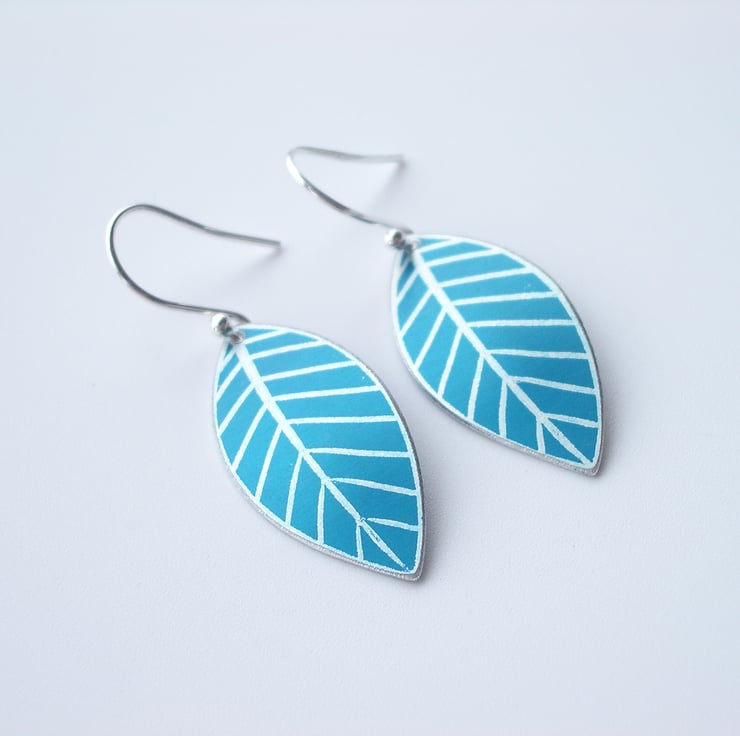 These blue leaf earrings are made from anodised aluminium which I have dyed in a petrol blue and printed with a silver leaf print. I hand cut the leaf shapes using a piercing saw and file the edges to give nice clean lines and smooth edges. Finally, the leaves are domed slightly so that they catch the light nicely. The leaves measure approximately 27mm x 13mm and hang from sterling silver ear hooks.