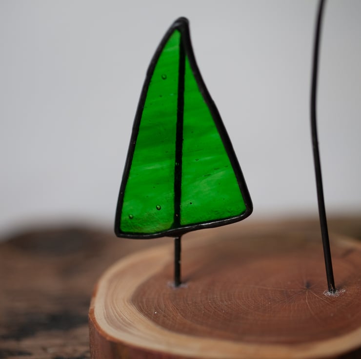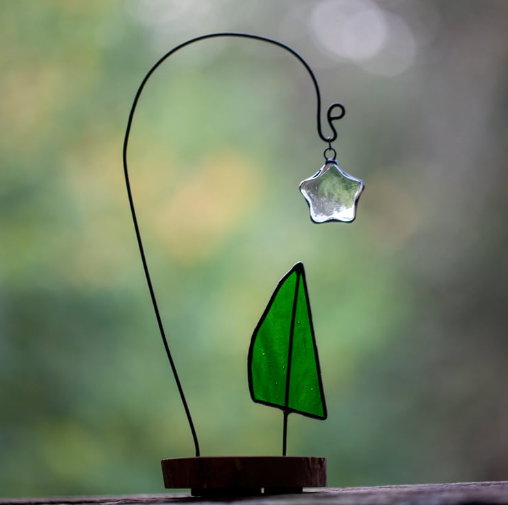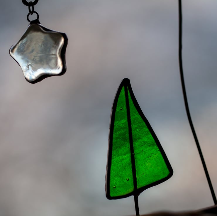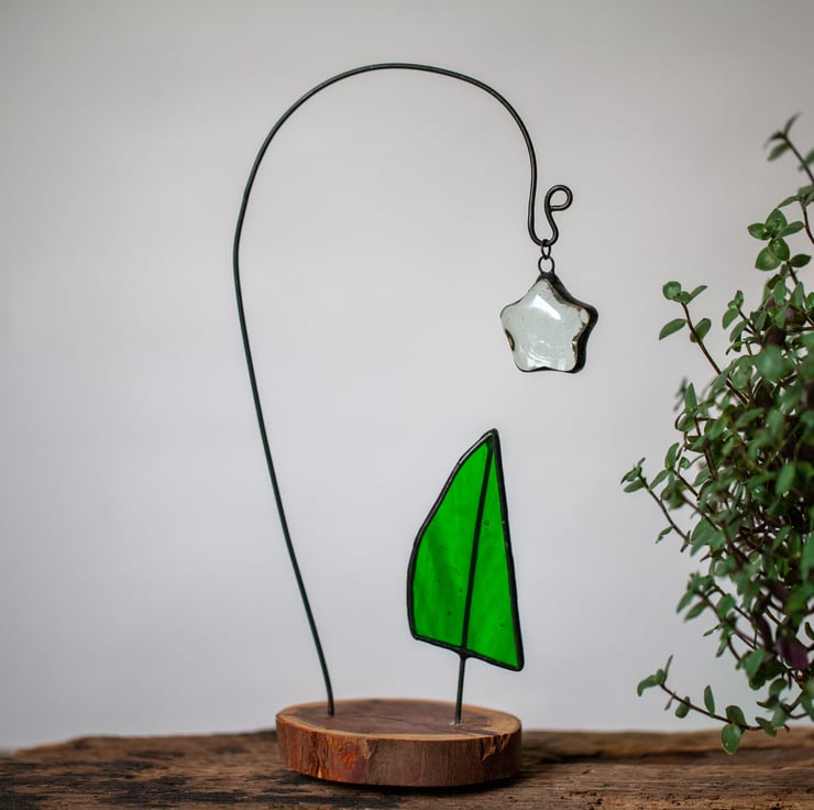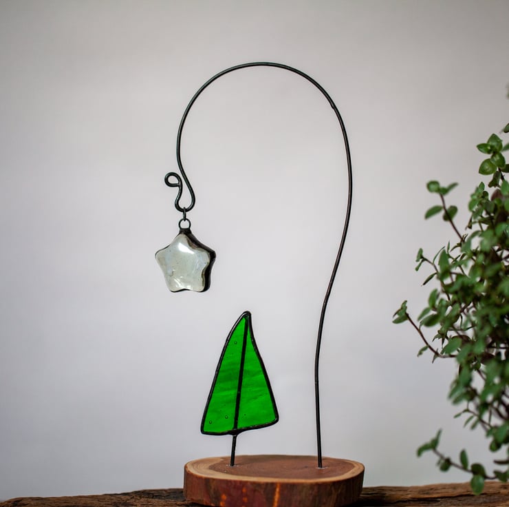 Miniature tree with a star hanging over it, set in a slice of wood. 20x10x7cm in the widest points. Makes beautiful Christmas decoration but not only.