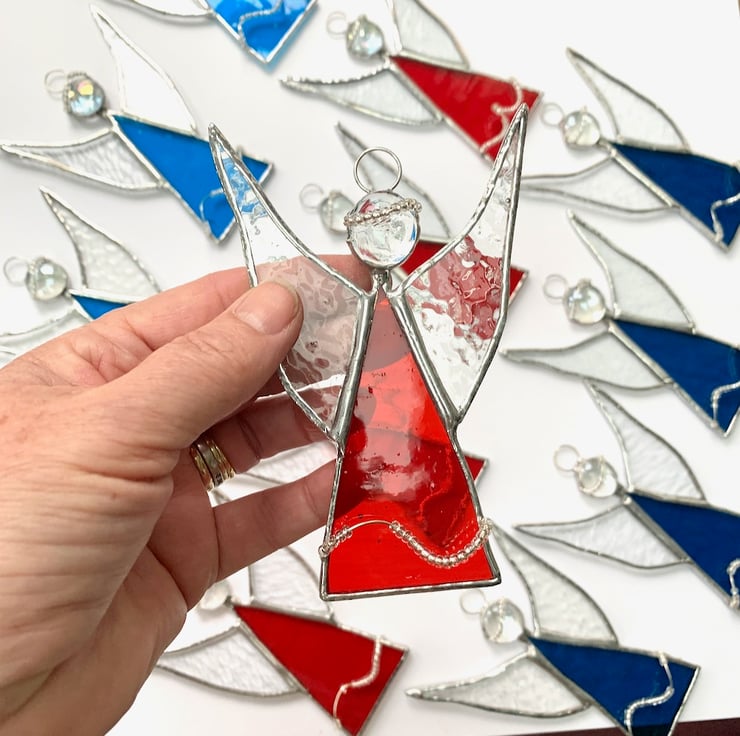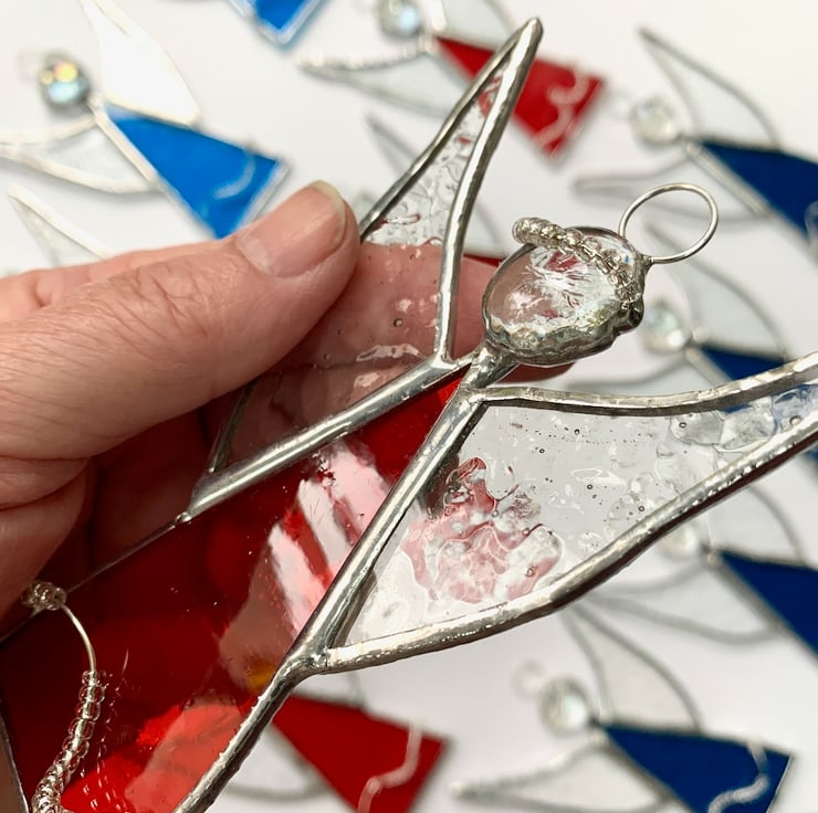 Each piece of glass has been hand cut, ground, washed, foiled, soldered together before being washed again. Beaded twisted wire has been used for the halo and skirt to add a bit more interest.