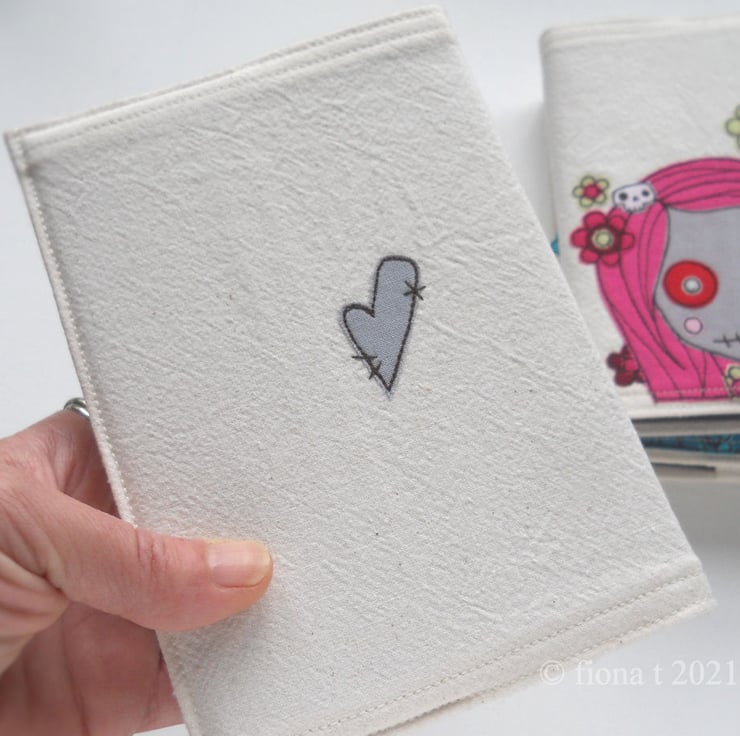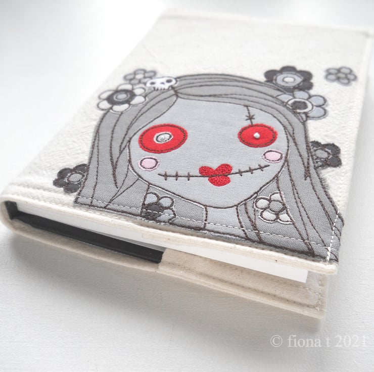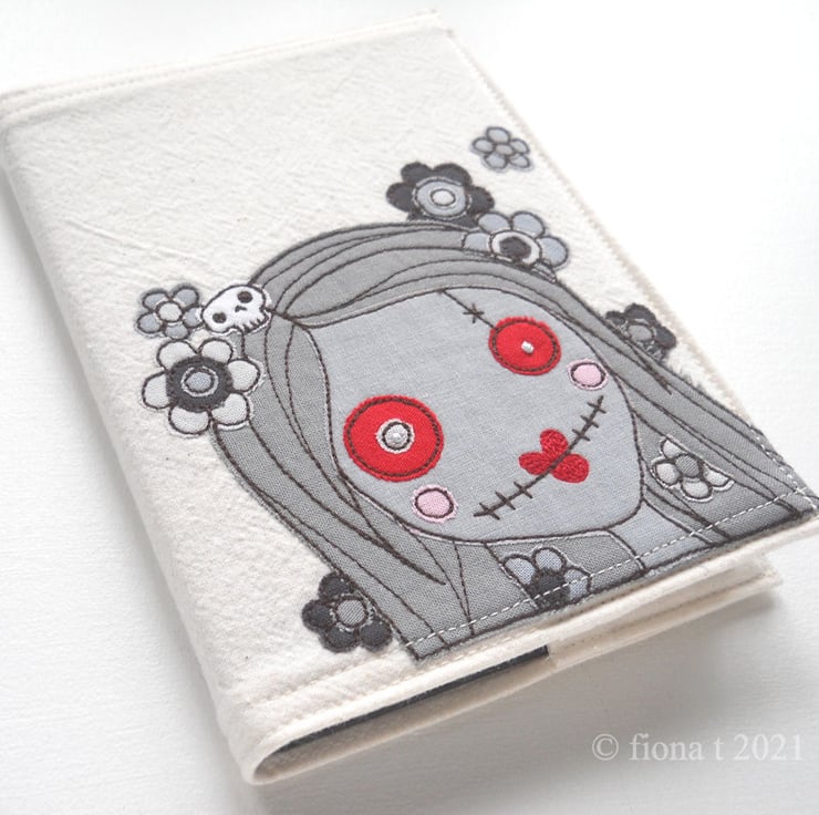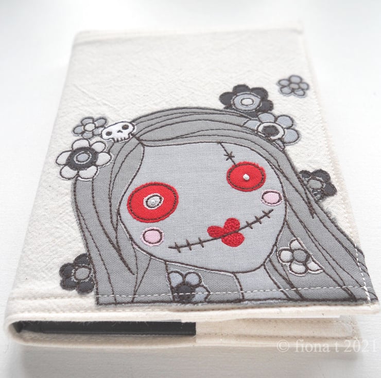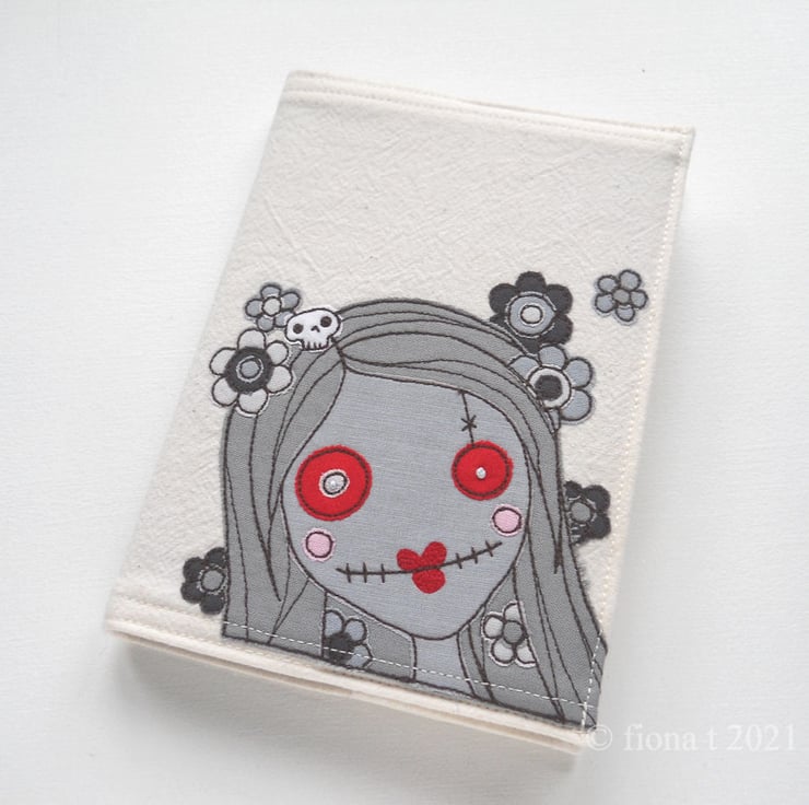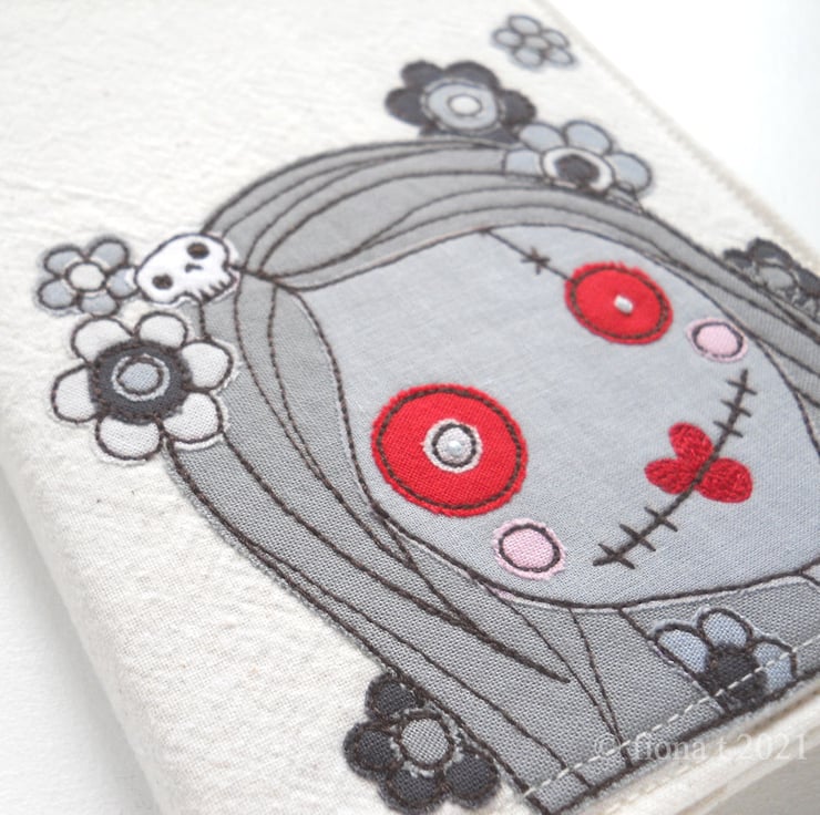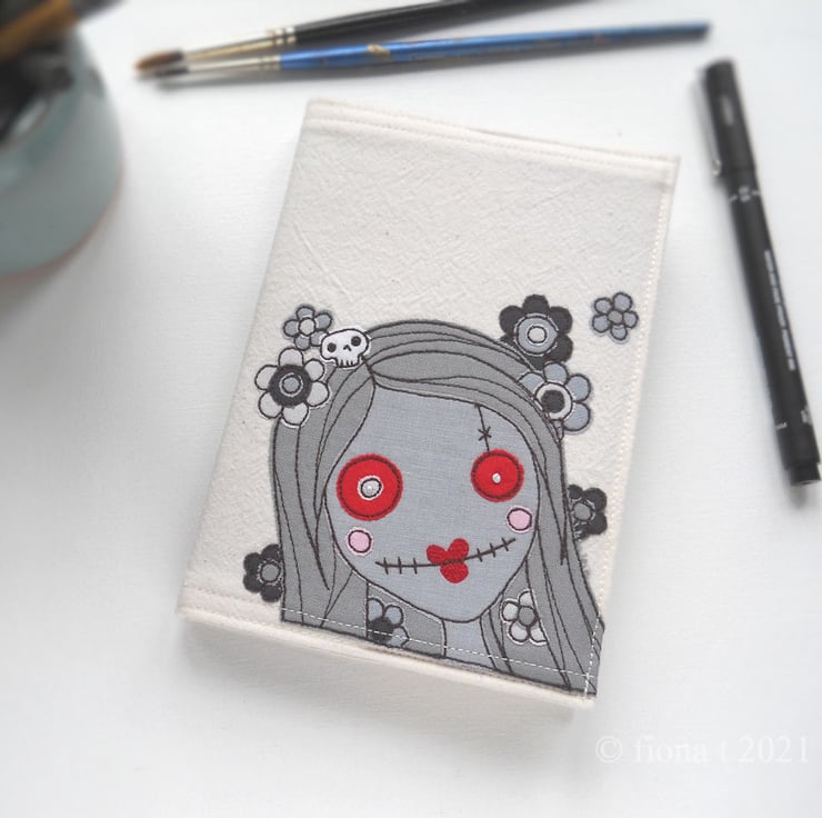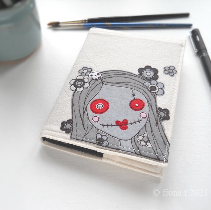 applique & freehand embroidered flower crown zombie notebook cover with A6 sketchbook inside.