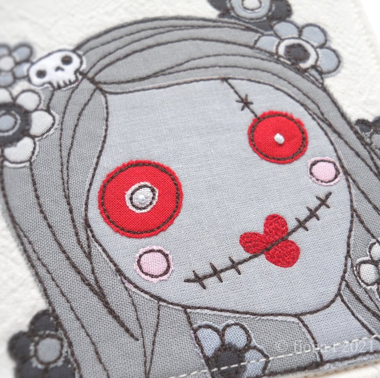 monochrome zombie girl is done up real pretty - her grey hair is decorated with tiny flowers & skulls, cut from coordinating cottons, her red stitched lips contrast with her deathly pale corpse grey face, and her eyeballs are hand embroidered.
