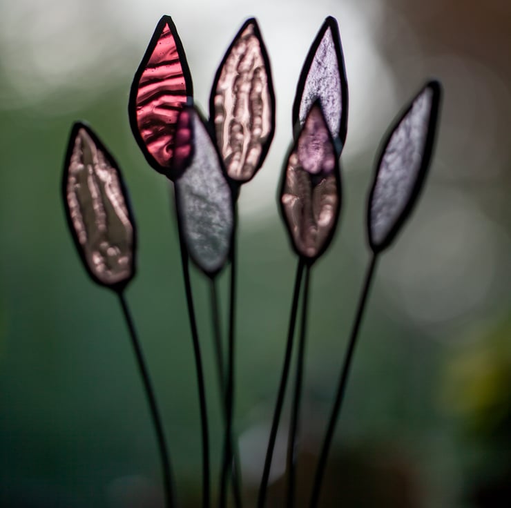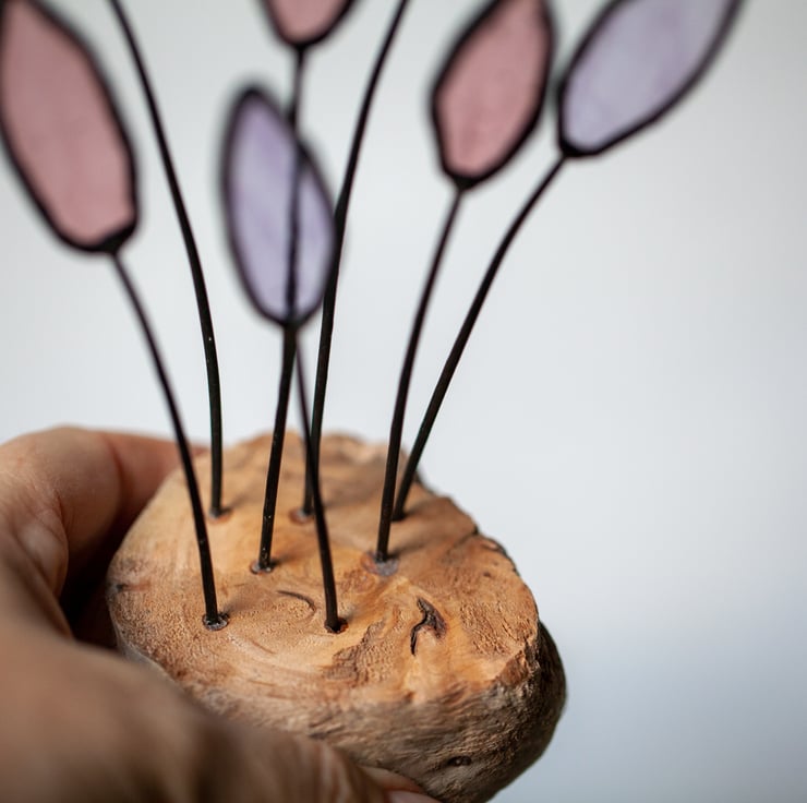 Bunch of stained glass flowers made to add some colour to your home. It looks great on window sill or shelf. Flowers are set in waxed slice of wood.