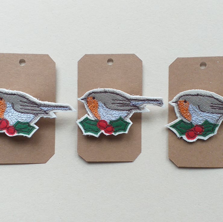 This cheeky wee fellow is made with hand cut fabric scraps appliqued onto cotton with a stiffening layer, then embroidered using free motion embroidery in different coloured threads. He measures approximately 8cm wide by 5cm high.