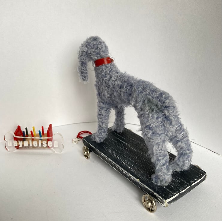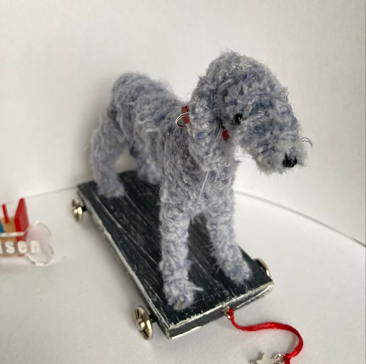 Hand sculptured Bedlington Terrier on a wooden pull along trolley. The trolley is hand painted and distressed and has wheels which are for decoration only. His eyes are black glass beads and he has a red leather collar.