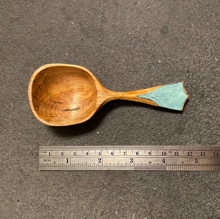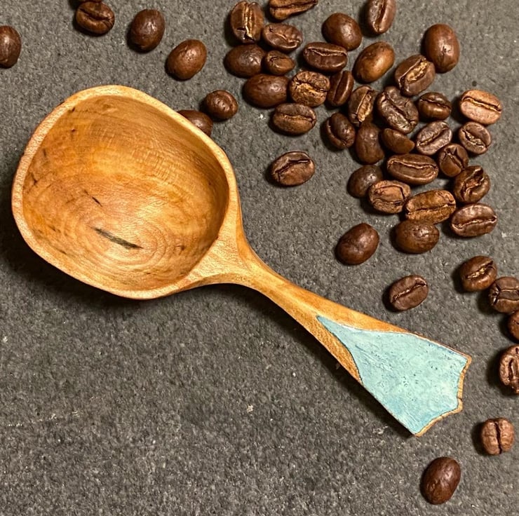 This squared Sycamore wood scoop holds 1Tbsp as a level measure or over 1.5Tbsp if heaped, perfect for coffee, loose tea, sugar or similar. The lovely bright willow milk paint of the handle contrast well with the rich wood colour, and shines over a base layer of turquoise green just subtly peeking through. The handle length allows the scoop to be able to live in with your coffee or loose tea in the container if you wish.