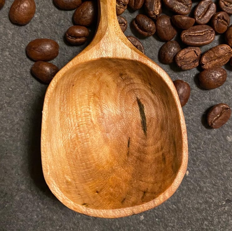 The scoop has been made from a freshly cut log, which was taken to its final shape using traditional methods- splitting the log firstly into a 'blank' using a froe tool, drawing on a rough shape before axing this out and then finalising the shape using an array of knives. This leaves beautiful cut facets which mean no sanding is required. After drying, the scoop receives a final shaping by knife, before a small makers mark is burned on using a pyrography pen. The scoop is then burnished using a smooth Scottish pebble leaving a silky feeling to the wood. And finally the wood is sealed using organic food grade linseed oil.