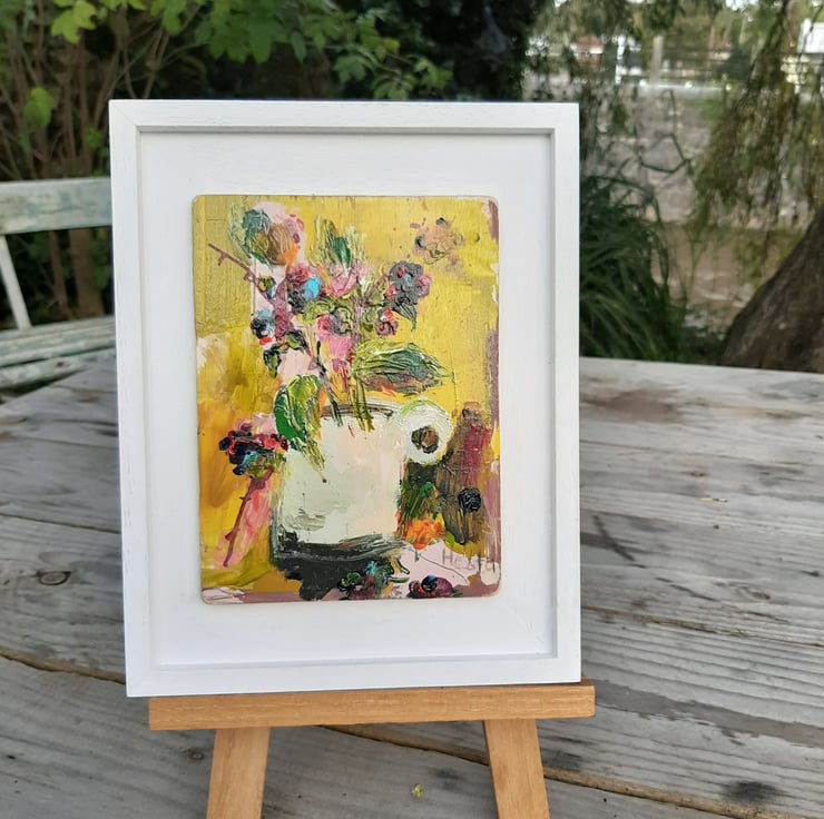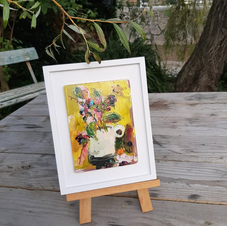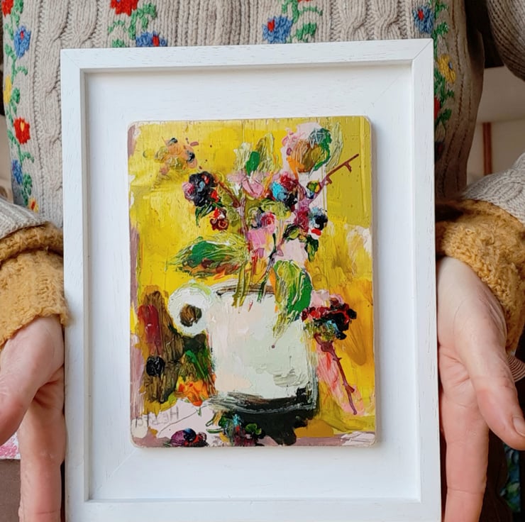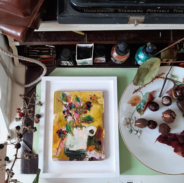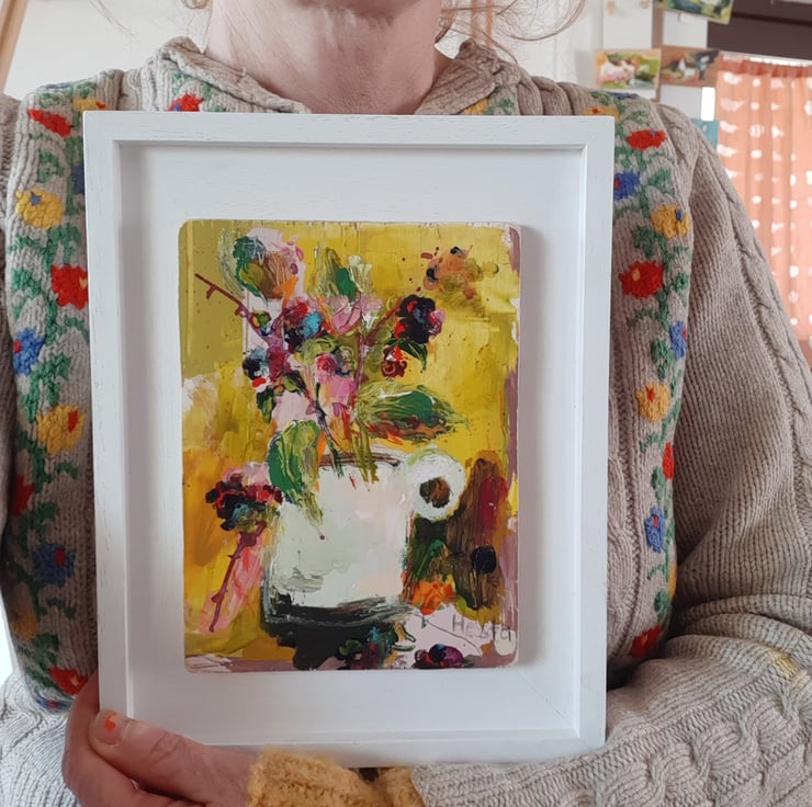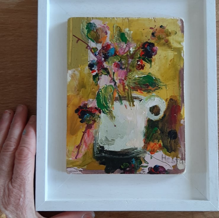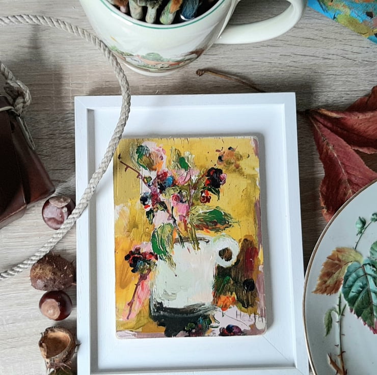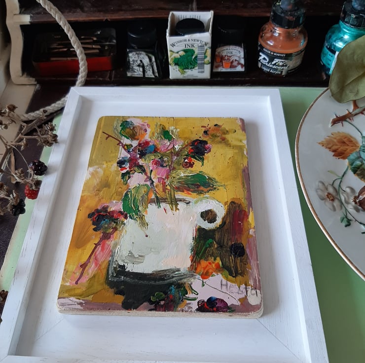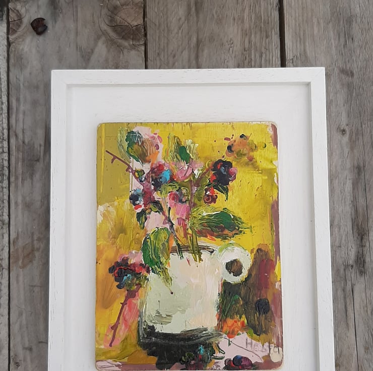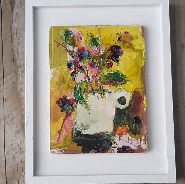 Autumn splendid in a jug. By artist hesta singlewood aka bodkincreates. A contemporary and confidently painted. Framed in a bespoke handmade frame that are made locally. Deep jewelled autumn colours. Brambles at there most beautiful