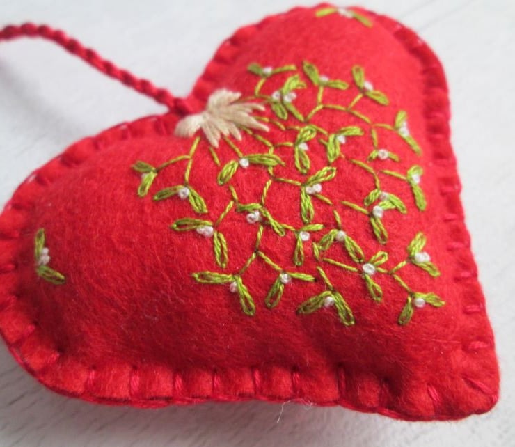 A one of a kind keepsake heart Christmas decoration - rich, holly berry red, wool felt hand embroidered with a bunch of pale green mistletoe, with creamy berries, 'tied' with a gold bow. Edged with red blanket stitch, the little heart is lightly stuffed and finished with a twisted thread hanging loop. It measures 9.5 cm wide by 8 cm high.