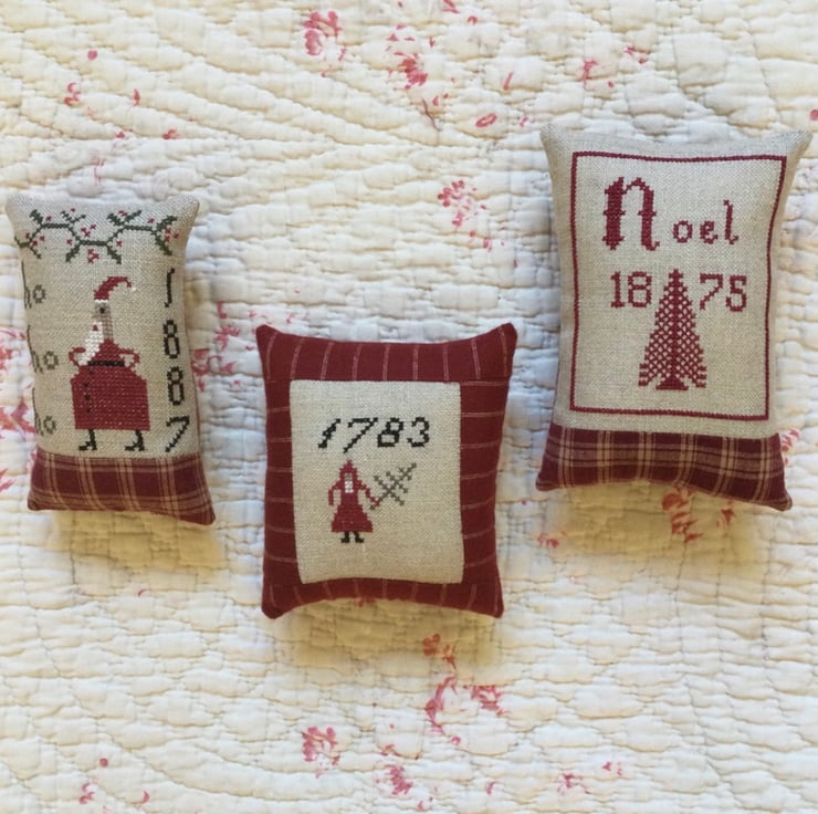 A small decorative shelf cushion, with a cross stitch embroidery on linen, finished off with a homespun check base.