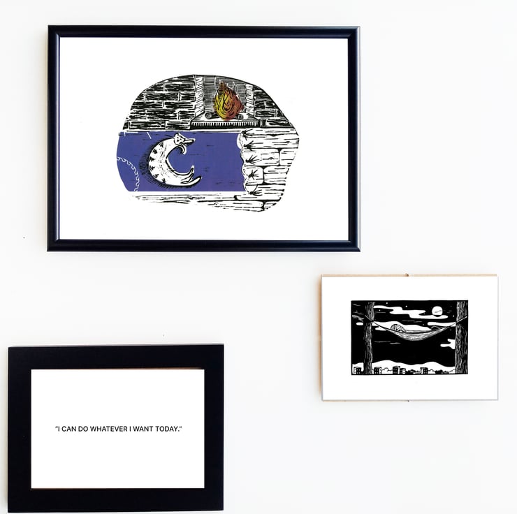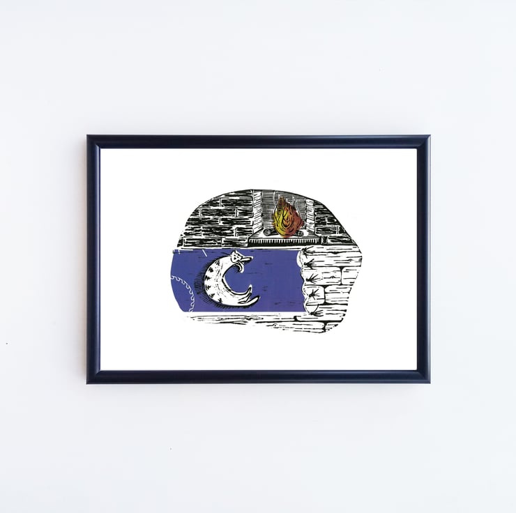 This is an atmospheric original linoprint that will inspire you to sink into the sofa and relax.