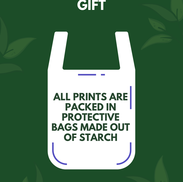 Prints are packed in protective plastic free materials and shipped in sturdy cardboard-backed envelopes with Royal Mail.