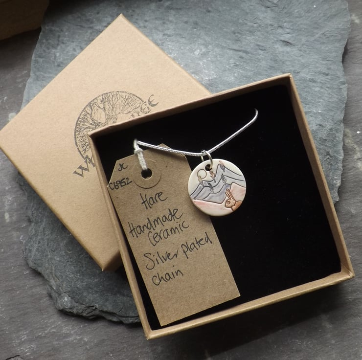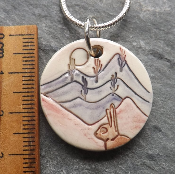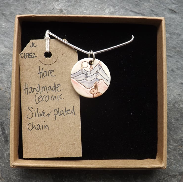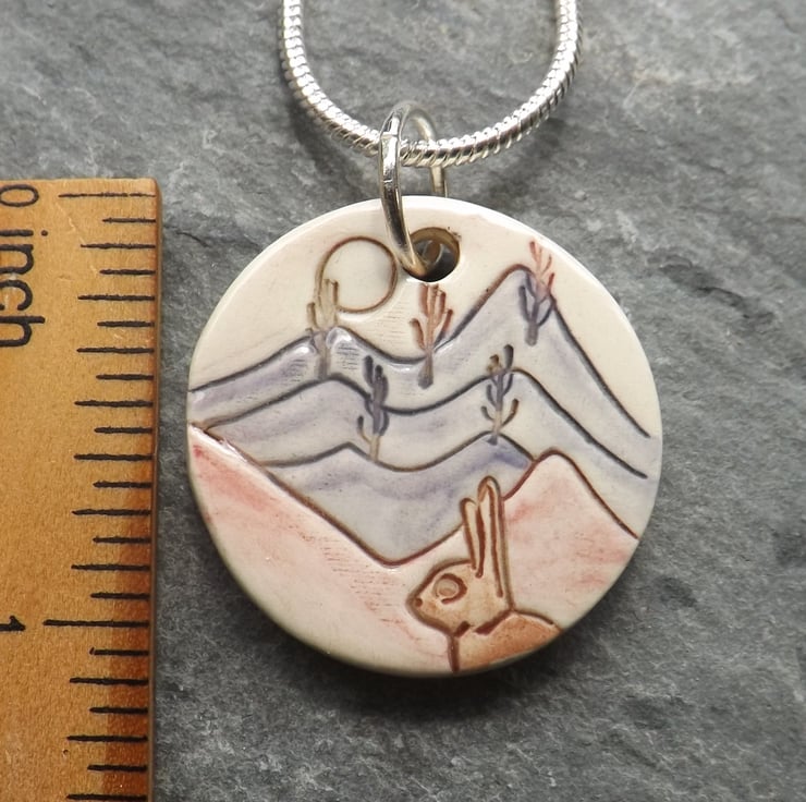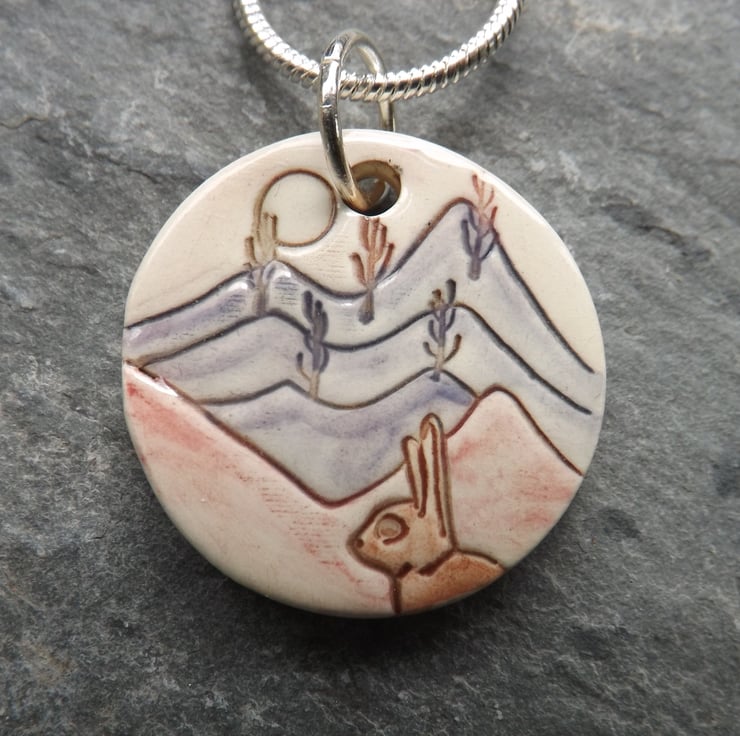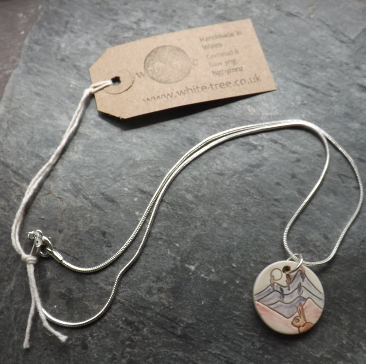 This circular pendant features a hare, mountains and the full moon. It is painted in soft twilight tones of lavendar and rose pink. As with all my jewellery it is made and decorated entirely by hand.