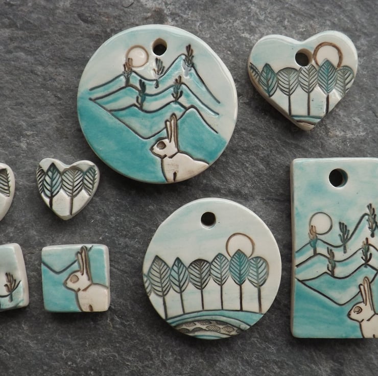 After forming my pendants from fine white clay, I imprint my design. When dry, I sand the back and sides of the pendants and round off the edges to ensure they are super smooth. They then have their first firing. Next I paint them using under-glazes and apply a transparent glaze before firing again to earthenware. Being glazed all over they are smooth against the skin whilst retaining the texture of the imprinted design. The result is a pleasantly tactile item.