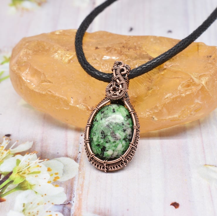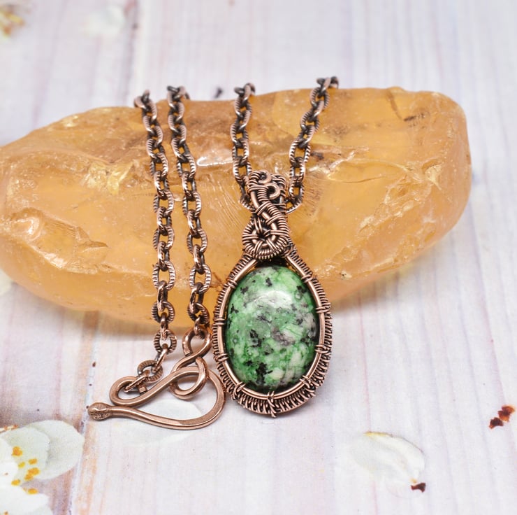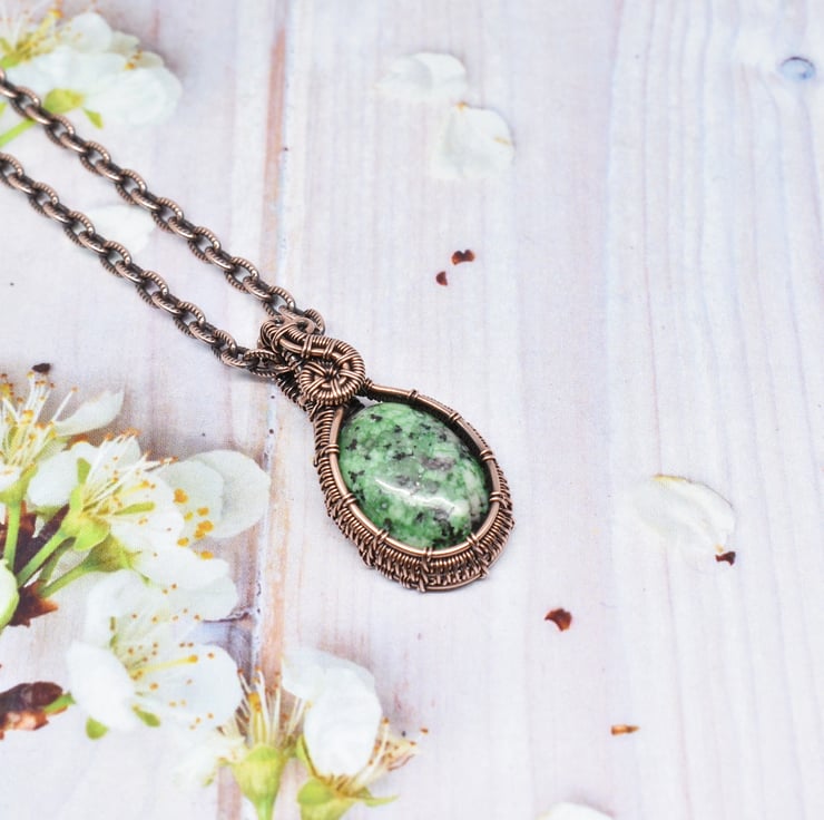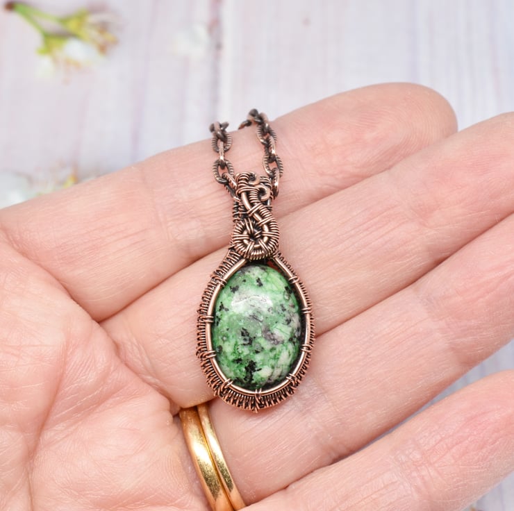 This dainty pendant is hand woven using solid copper wire around this pretty ruby zoisite stone. The pendant has been oxidised to age the copper then hand polished it to this lovely antique finish.