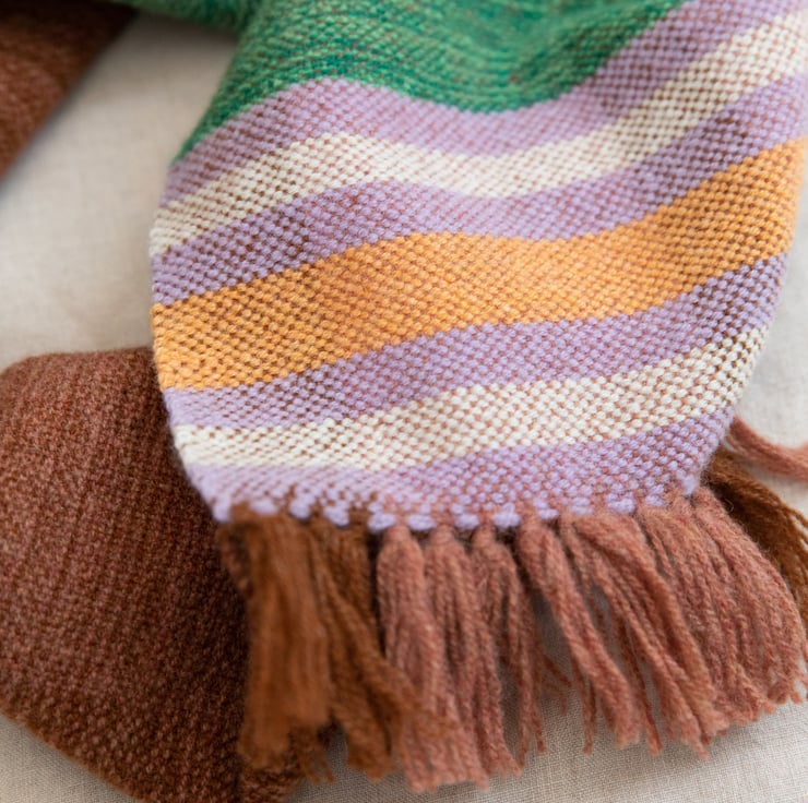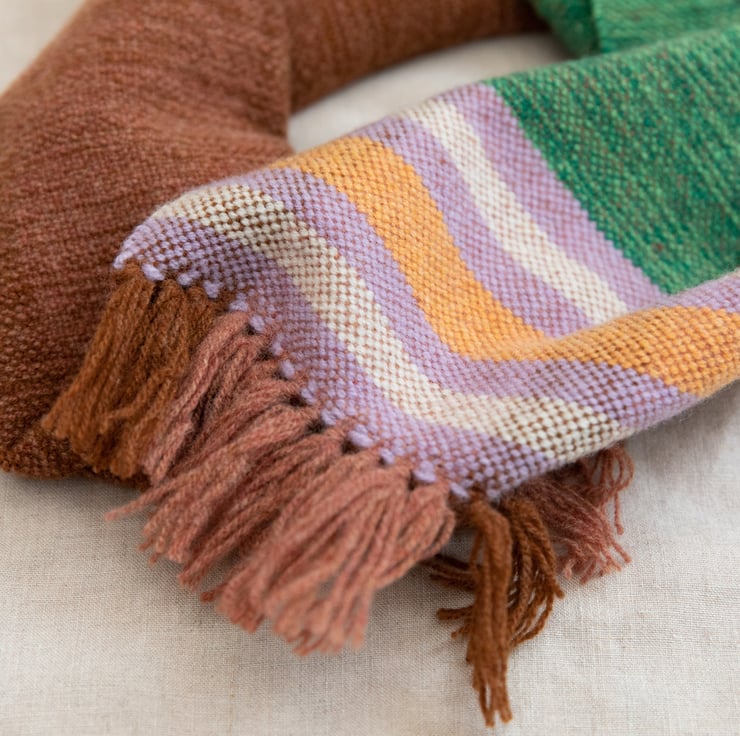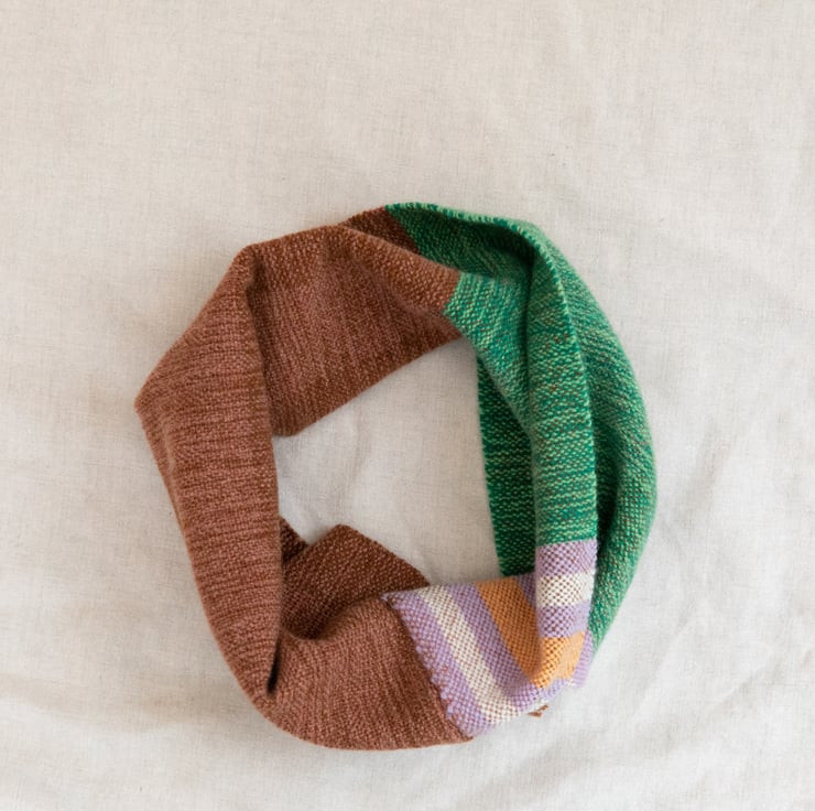 This collar / cowl is from my most recent collection called ‘At the bottom of the garden’ inspired by a new found passion for gardening throughout 2020. During the lockdown periods I immersed myself into slowly transforming my garden, creating some vegetable beds and growing plants from seeds. I watched as slowly the seedlings grew, became plants and then produced a harvest. My time has grown in the garden throughout 2021 and has continued to inform my practice. I remain inspired by fruit and vegetables, drawing on the incredible colours found within nature and translating these into hand woven products.
