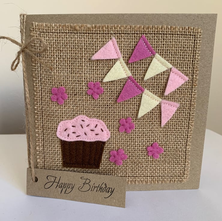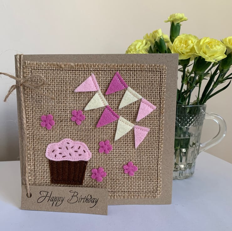 This greeting card is decorated with a chocolate and pink coloured cupcake, pink and cream bunting, and decorated with rose pink flowers.