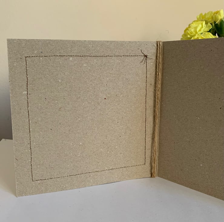 The hessian is machine stitched using, using a contrasting thread, onto a plain brown recycled card. This stitching is visible on the inside of the card.