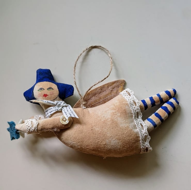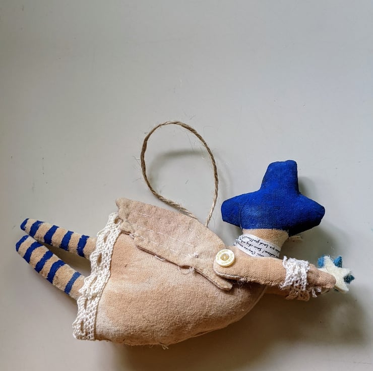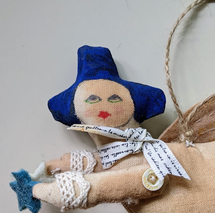 She is hand and machine stitched, hand stained and painted in cotton with a wee button on each arm and ribbon tied around her neck., she holds two tiny stars ( she is celestlial after all).