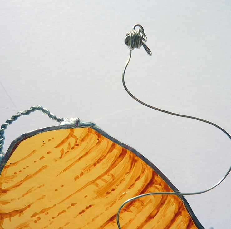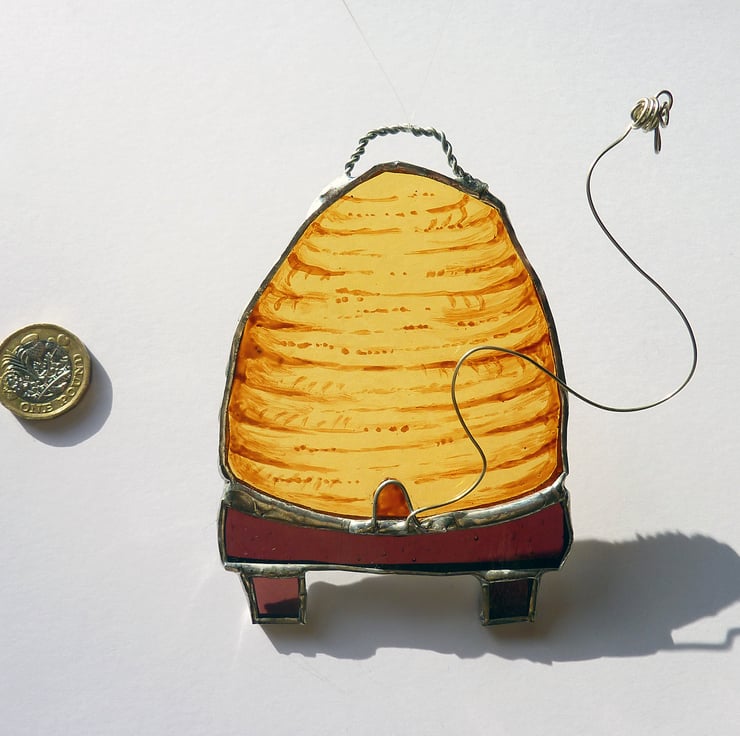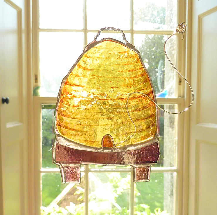 The glass is a mix of warm yellow and rich earthy purple. The glass is hand cut, wrapped and sealed in copper foil, assembled and finally soldered together using a soldering iron. The skep/hive is handpainted. A solitary wire bee buzzes about.