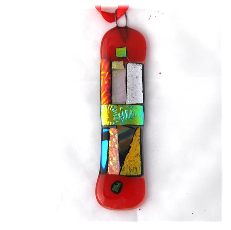 A fused glass suncatcher, decoration 10 x 2.5 cm. Fired in my little kiln at very hot temperatures (815 degrees, so hot the glass glows bright red) to fuse all the glass together and smooth the edges,