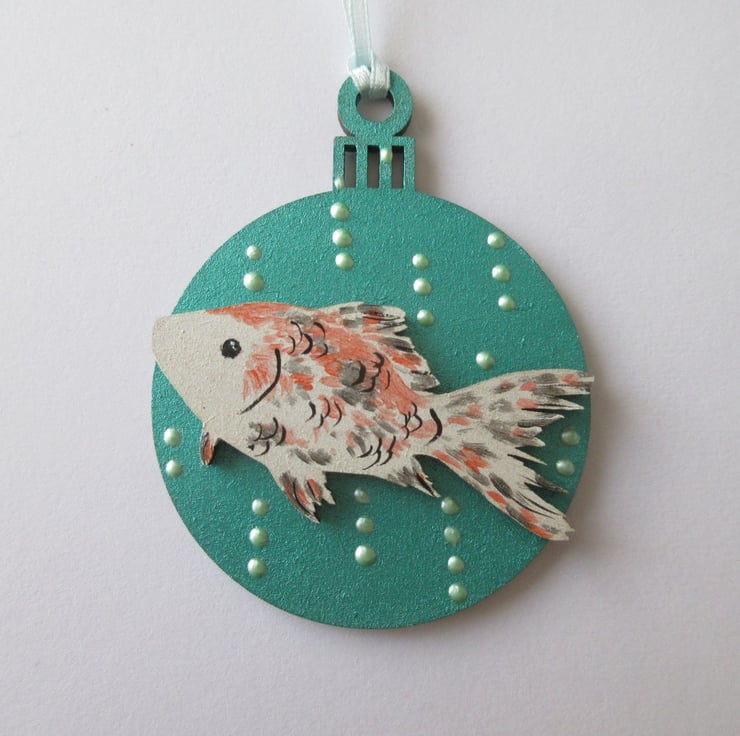 The wooden bauble shapes are 7cms diameter, and have a hand painted background, with raised bubbles. The bauble is embellished with a wooden fish shape, painted to represent a goldfish.