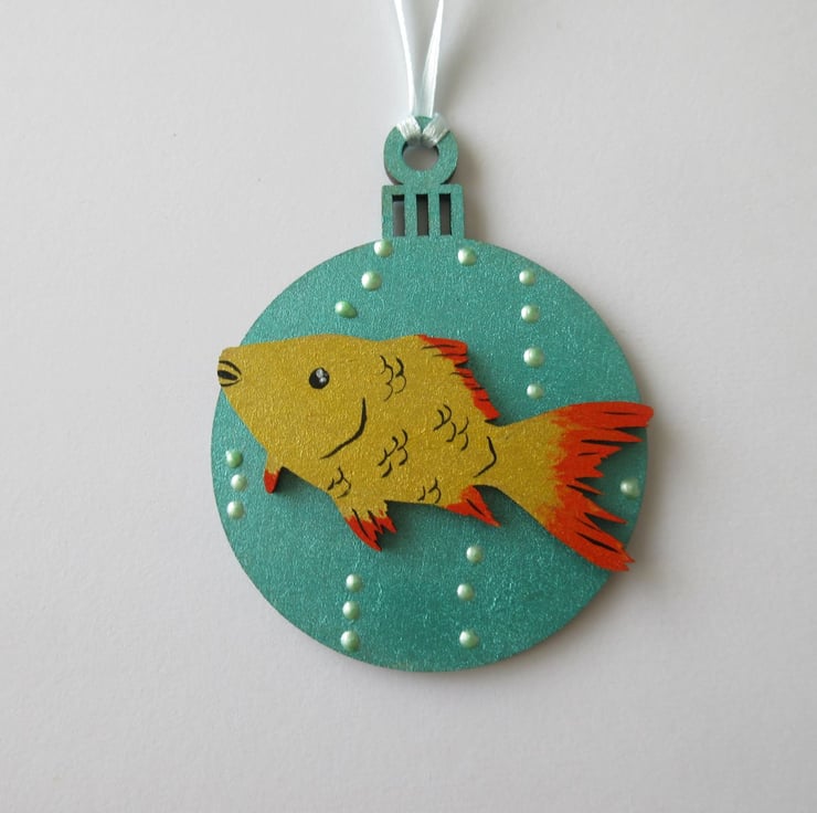 The wooden bauble shapes are 7cms diameter, and have a hand painted background, with raised bubbles. The bauble is embellished with a wooden fish shape, painted to represent a goldfish.